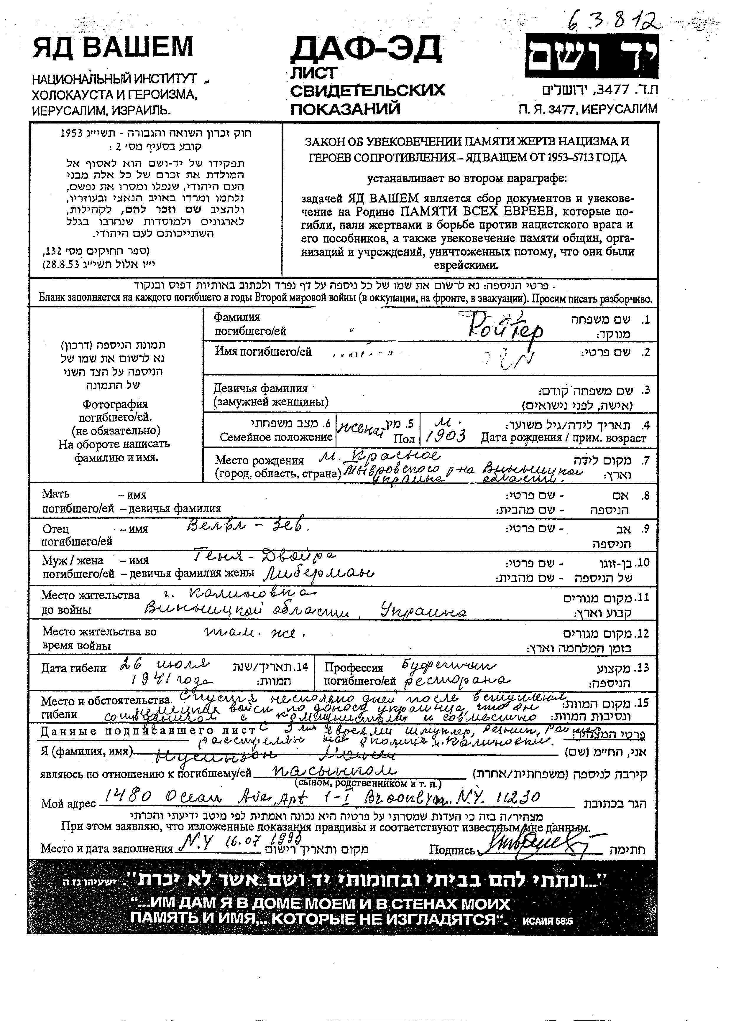 Yad Vashem - Pages of Testimony Names Memorial Collection