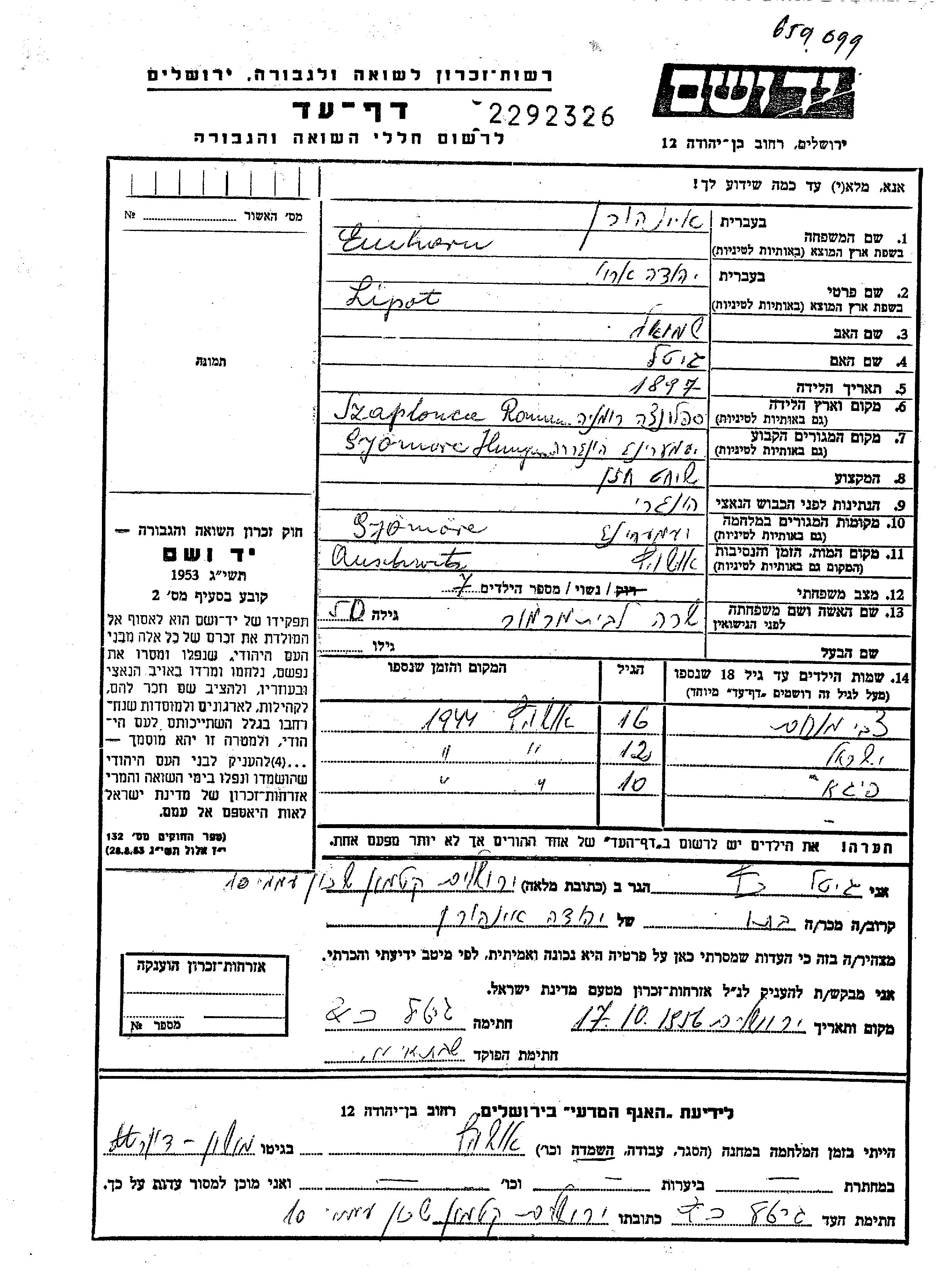 Einhorn | Yehuda Arie Lipot | 1897 | Gyomore, Hungary | Page of Testimony |