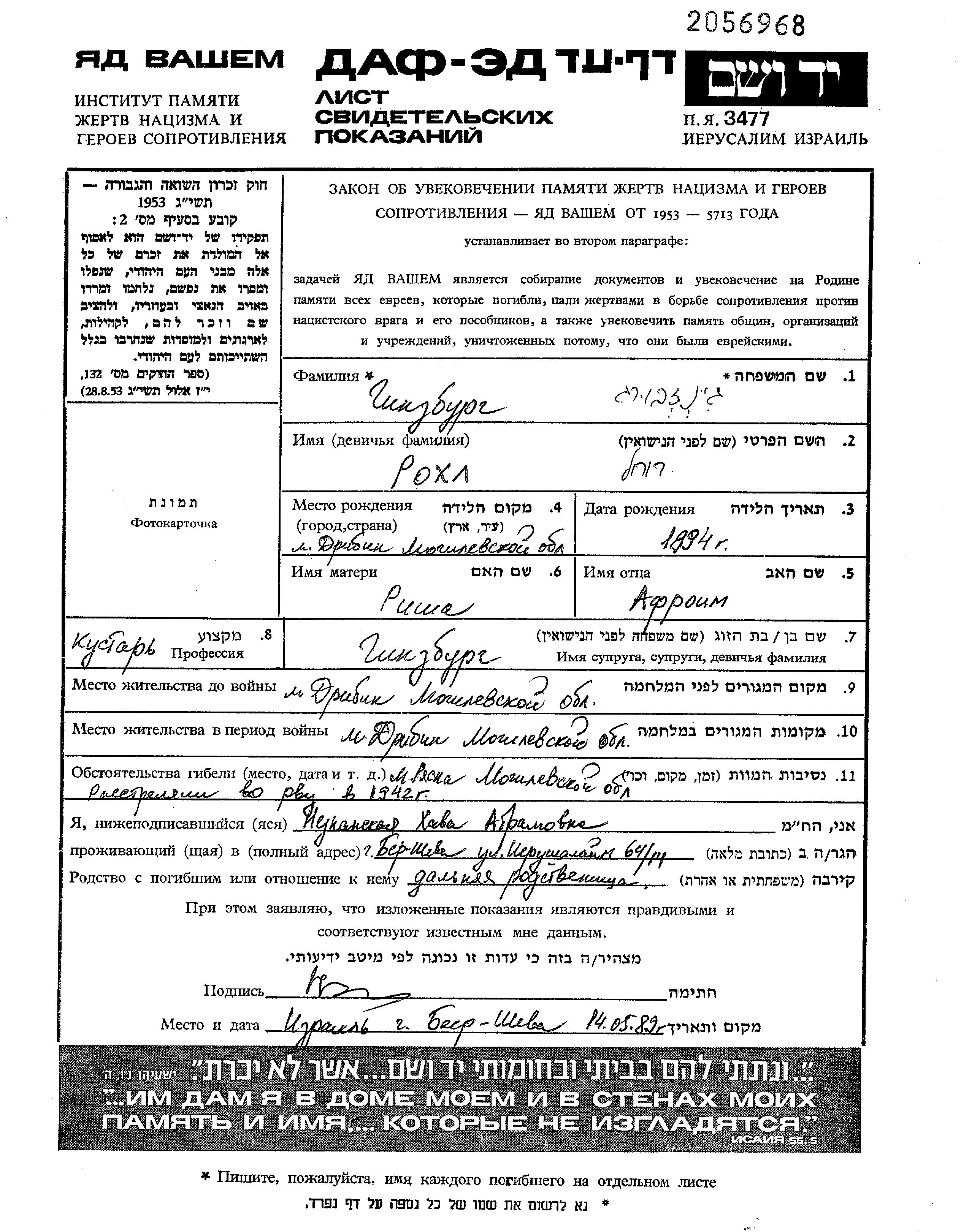 Ginzburg Rokhl 1894 Dribin, Belorussia (USSR) Page of Testimony