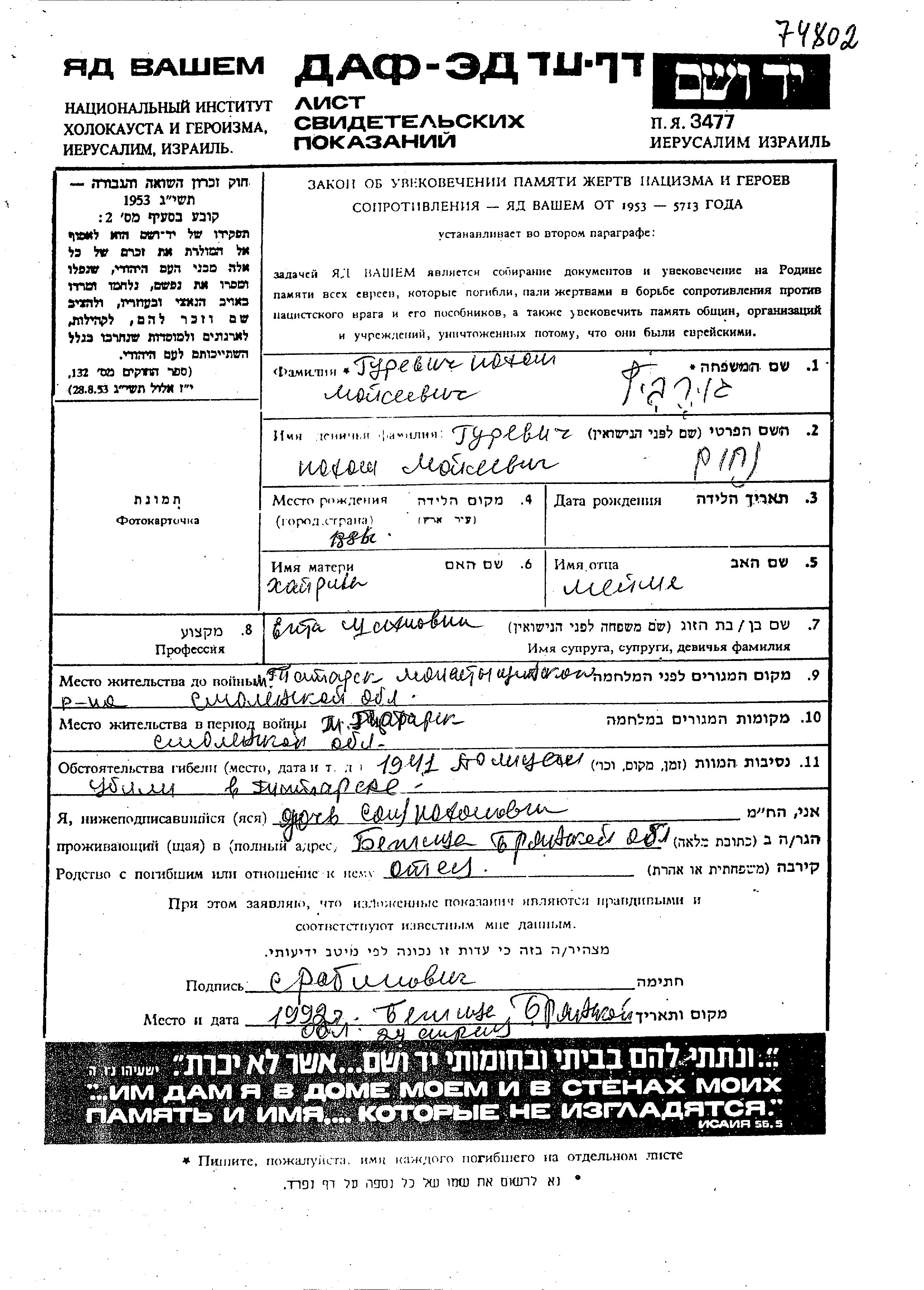 Nokhom Gurevich was born, 1886 to Meishe and Khay Riva. He was married to Yenta. Prior to WWII he lived in Tatarsk, Russia (USSR). During the war he was in Tatarsk, Russia (USSR). Nokhom was murdered in the Shoah. Place of death: Tatarsk, Russia (USSR), 1941.