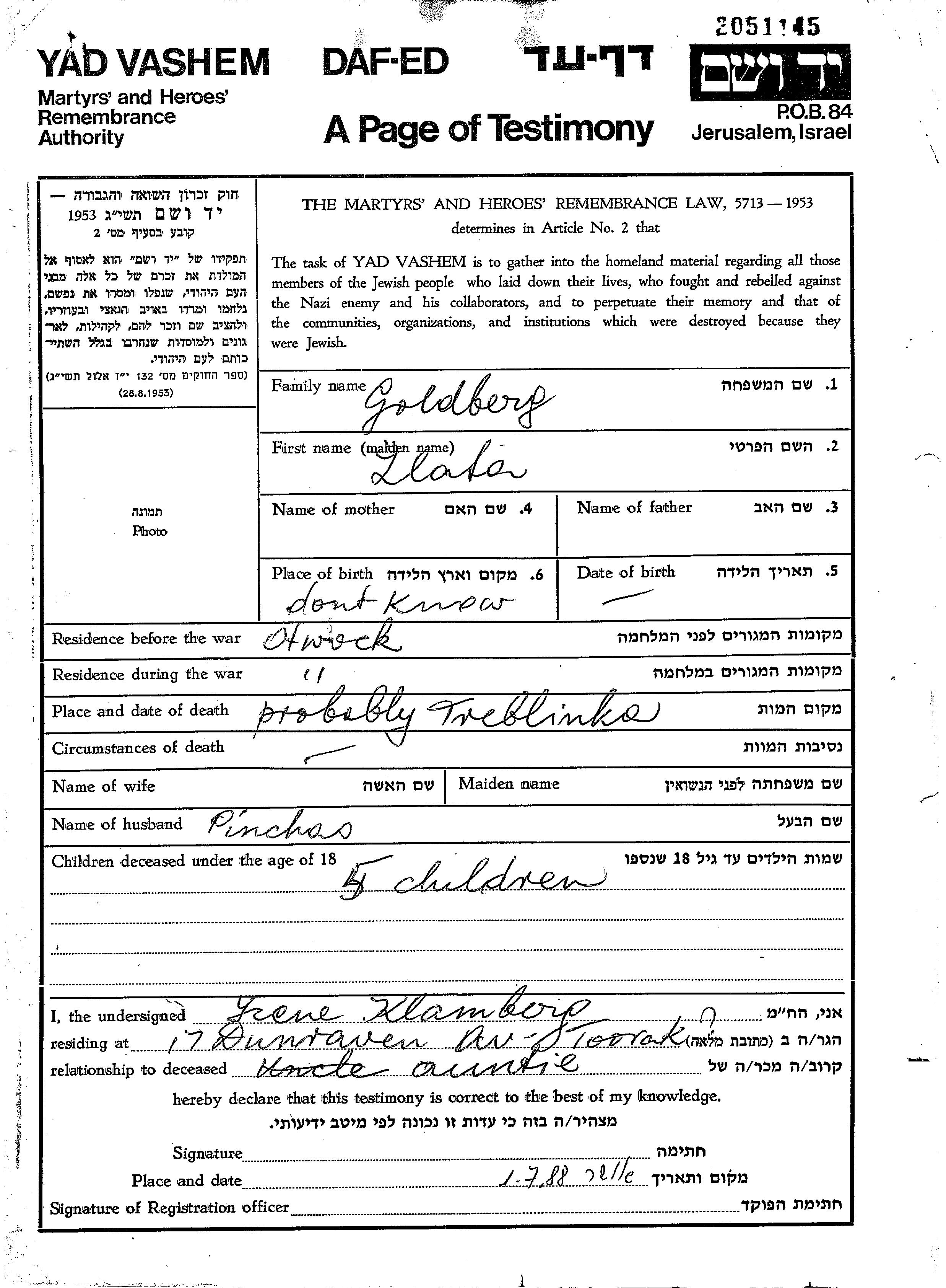 Goldberg Zlata Otwock, Poland Page of Testimony
