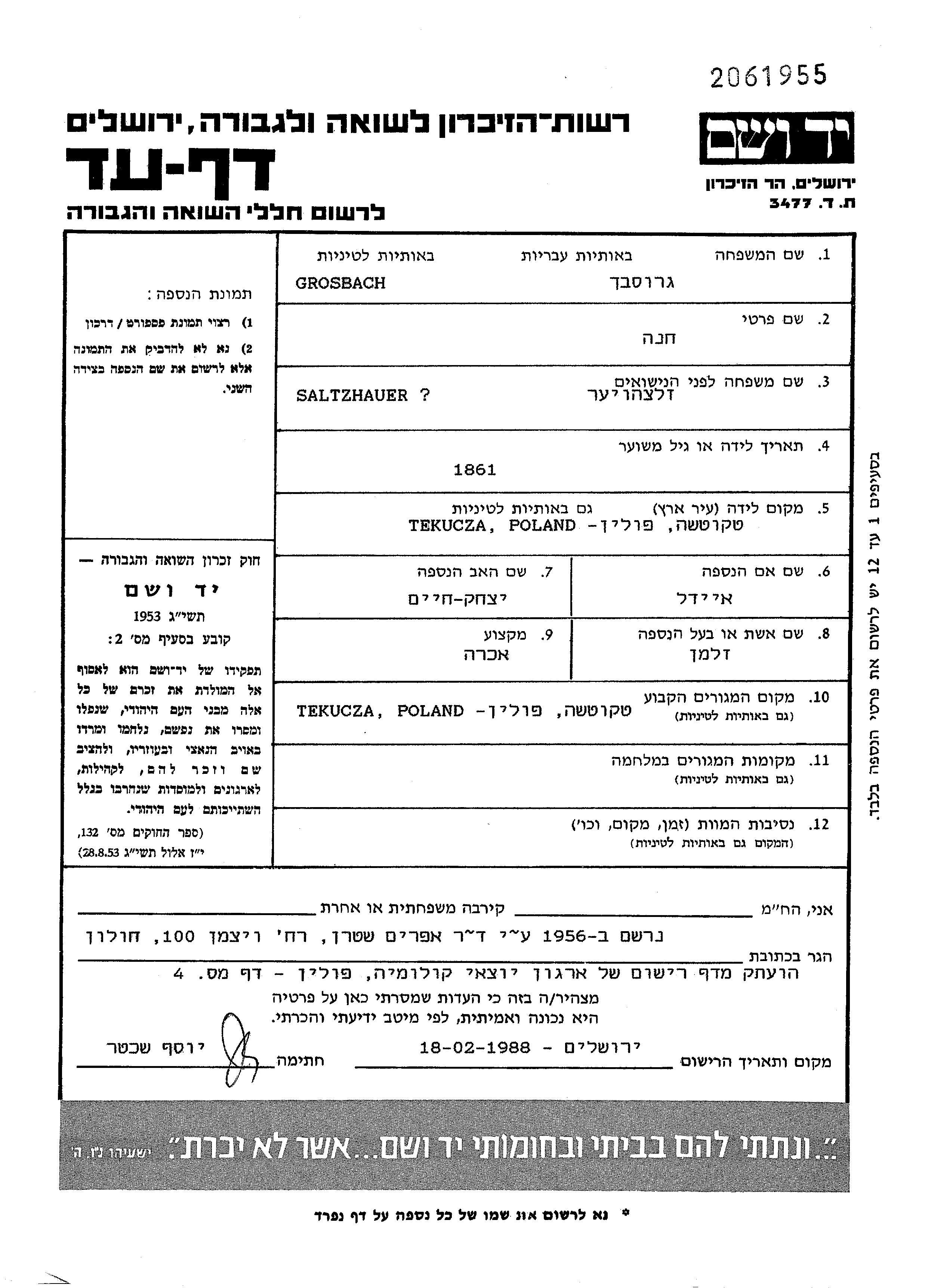 Grosbach Khana 1861 Tekucza, Poland Page of Testimony