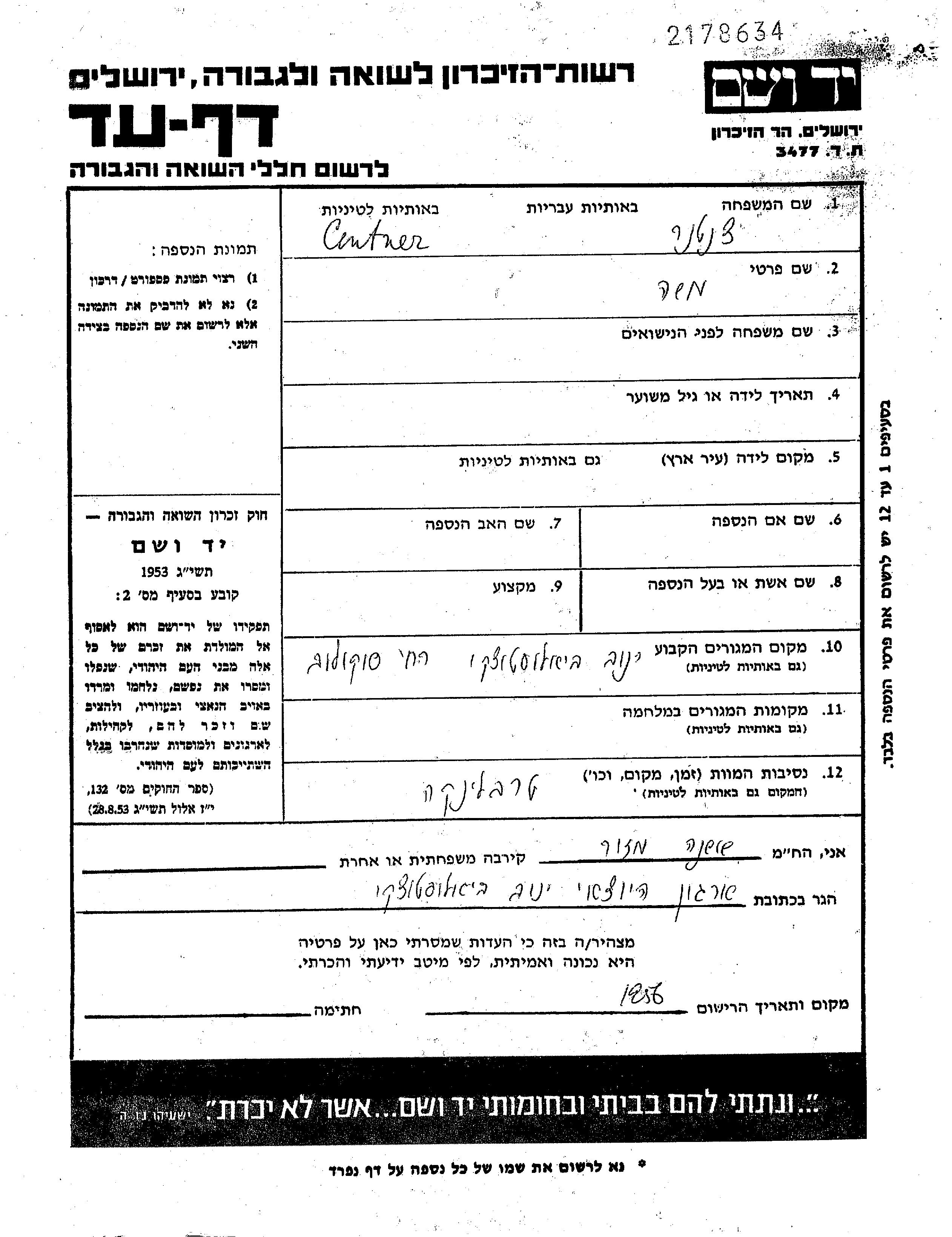 Centner Moshe Janow Sokolski, Poland Page of Testimony
