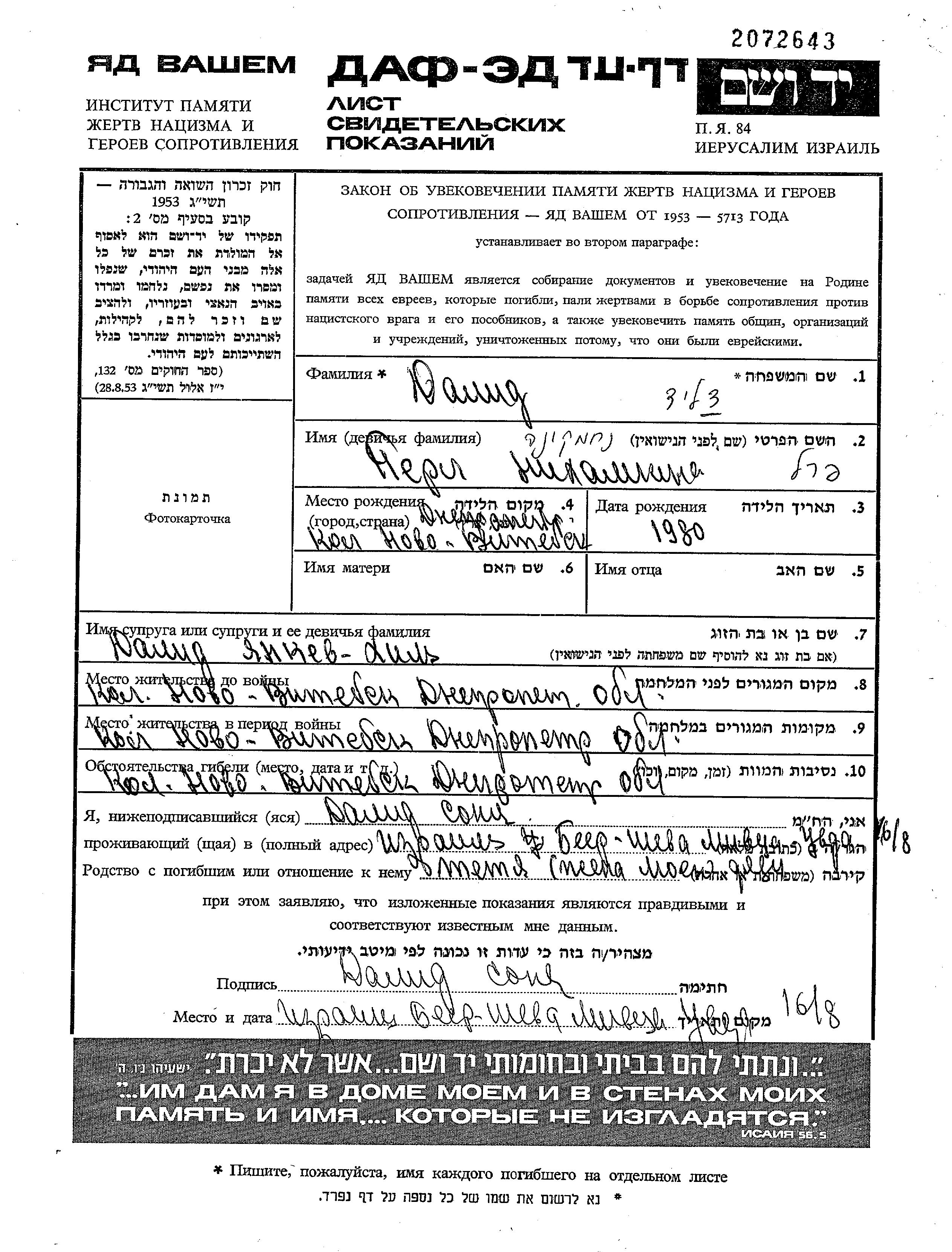 Yad Vashem - Pages of Testimony Names Memorial Collection
