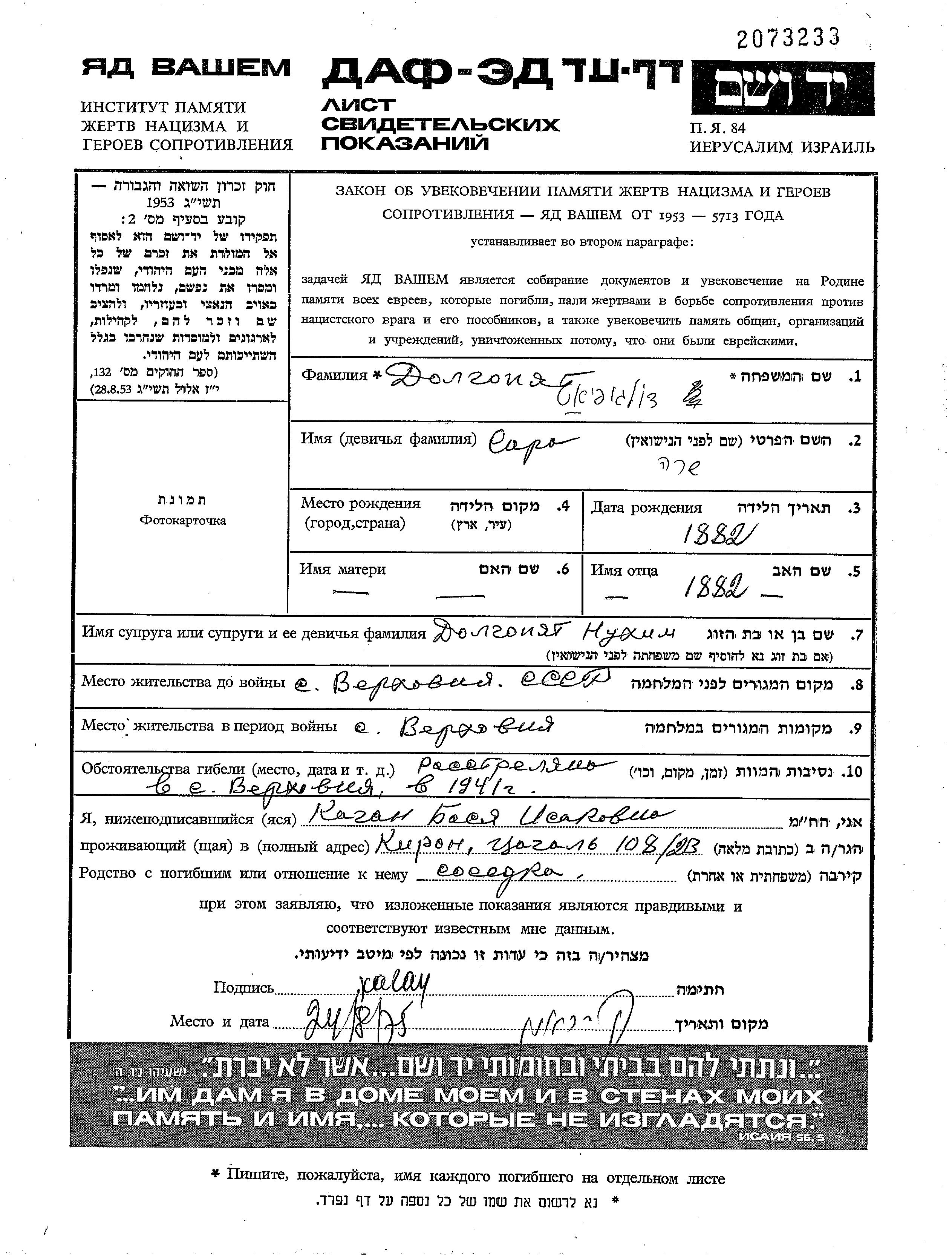 Dolgopyat Sara 1882 Verkhovnya, Ukraine (USSR) Page of Testimony