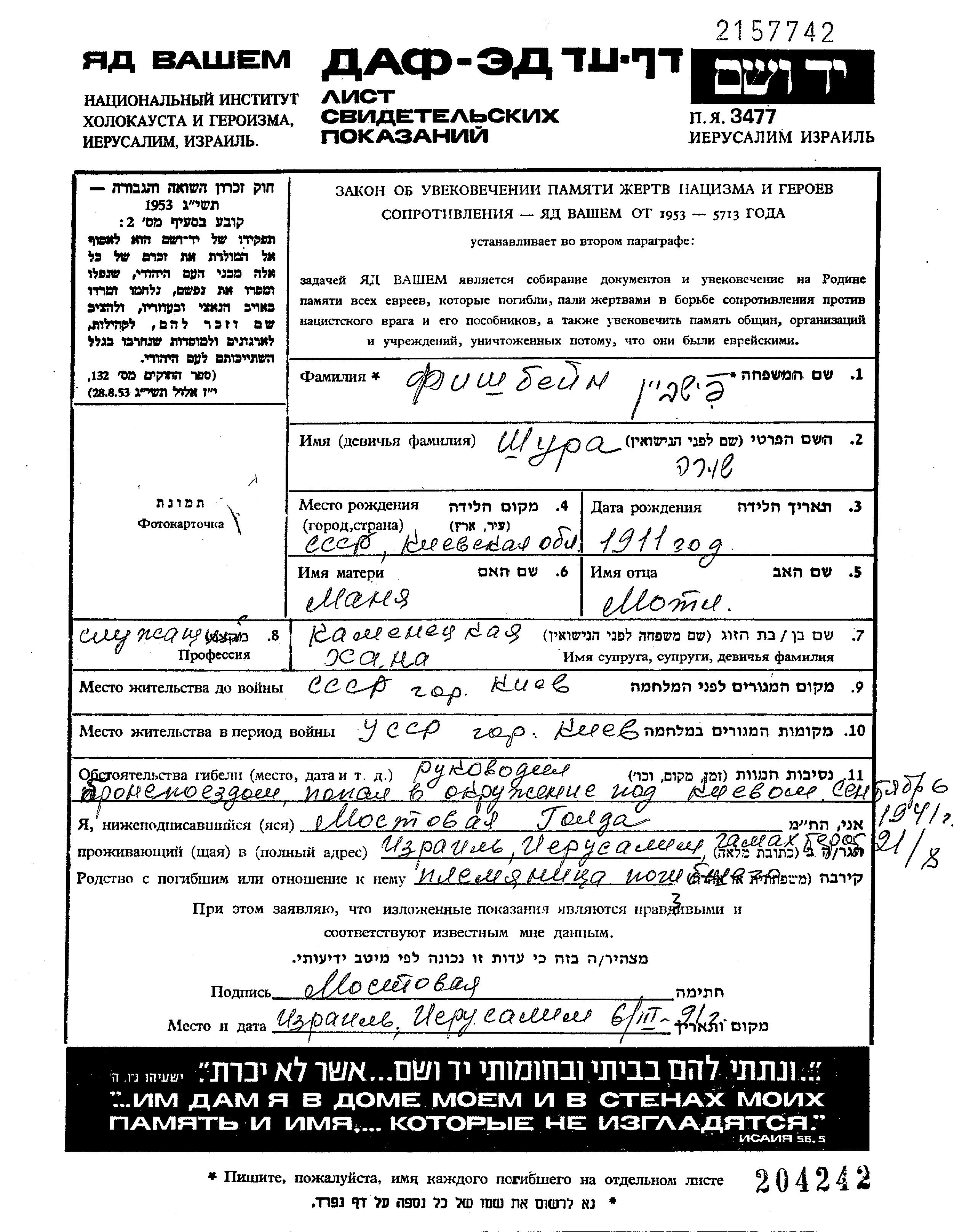 Fishbein Shura 1911 Kiyev, Ukraine (USSR) Page of Testimony