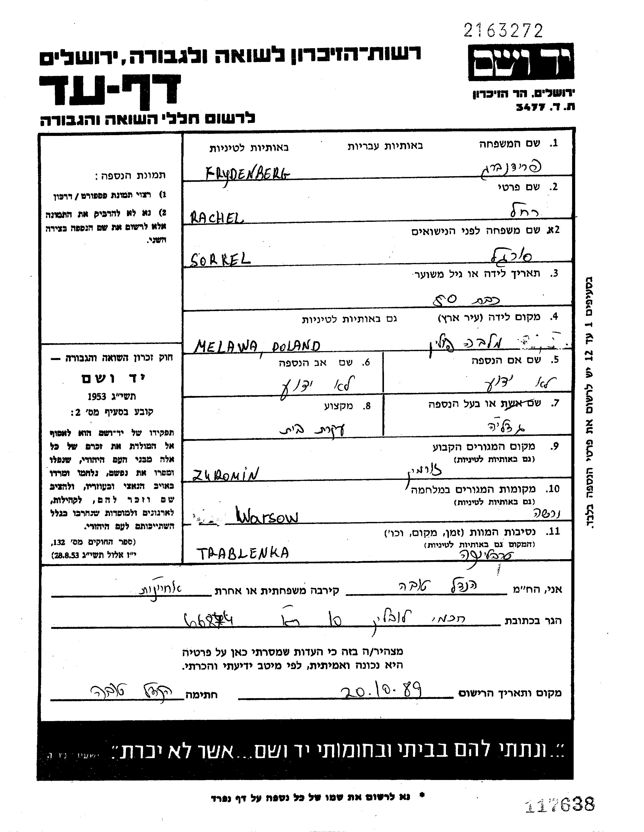 Frydenberg Rachel Zuromin, Poland Page of Testimony