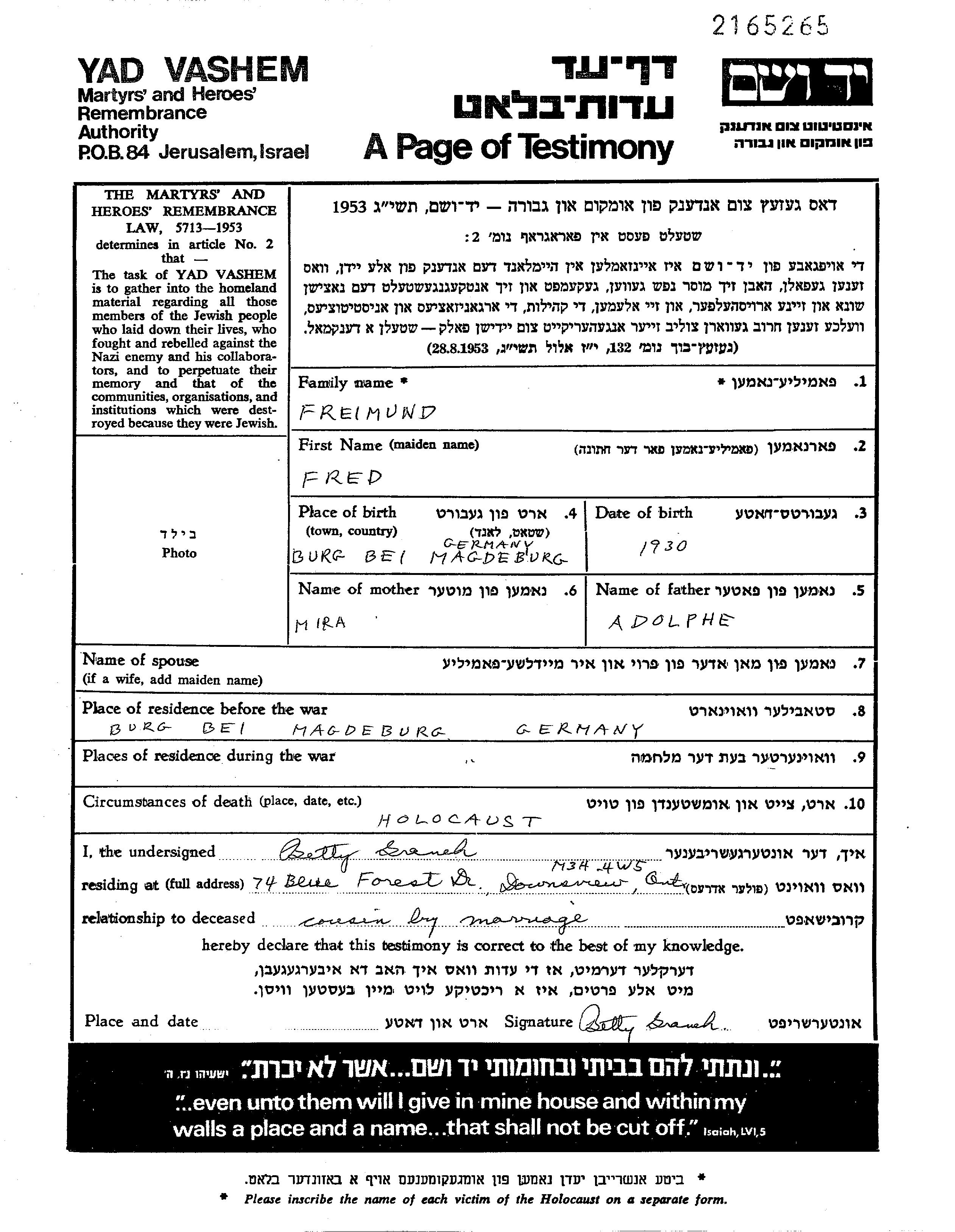 Freimund Fred 1930 Burg, Germany Page of Testimony