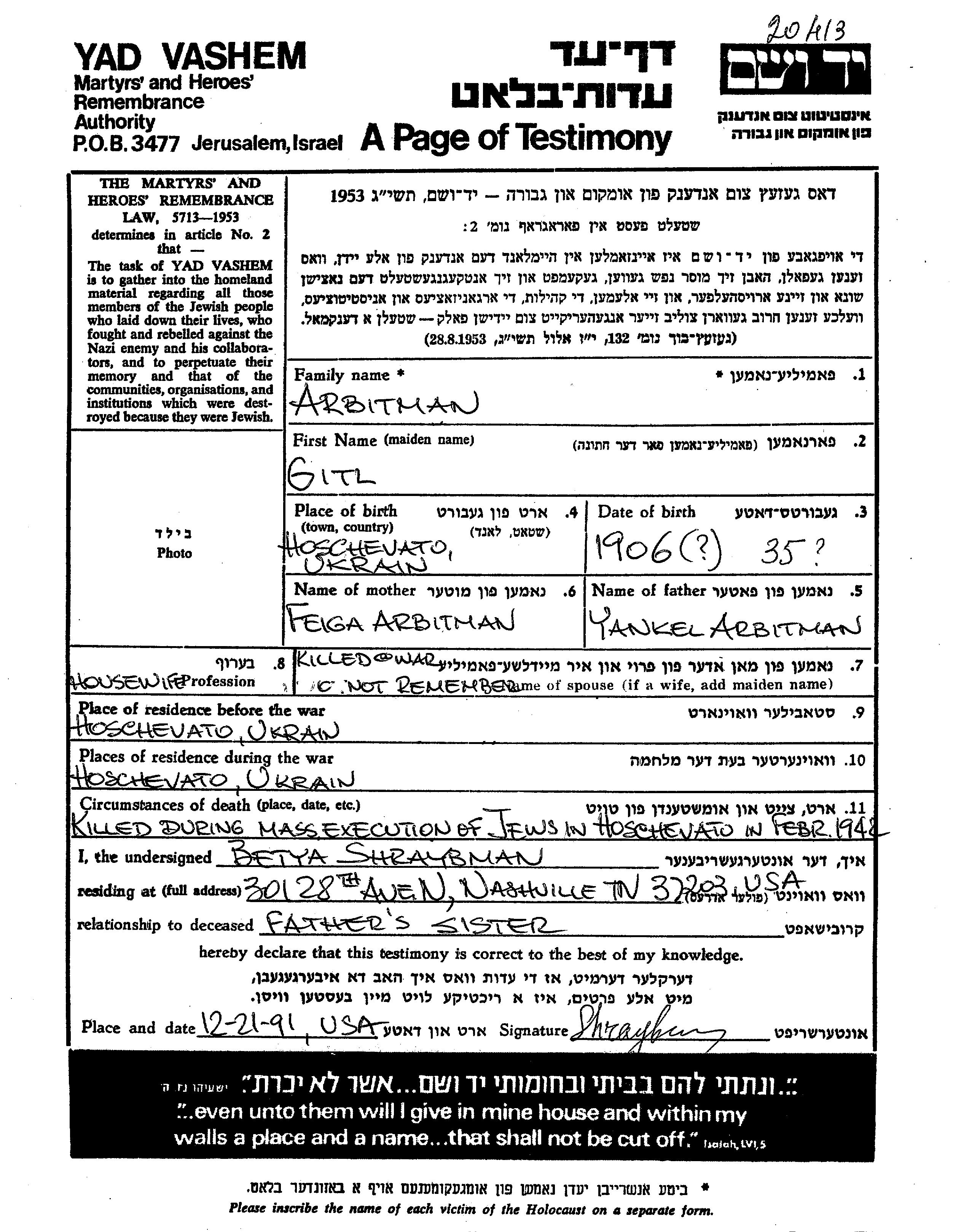 Gitl Arbitman was born in Khashchevatoye, Ukraine (USSR), 1906 to Yankel and Feiga nee Shvets. She was a housewife and married. Prior to WWII she lived in Khashchevatoye, Ukraine (USSR). During the war she was in Khashchevatoye, Ukraine (USSR). Gitl was murdered in the Shoah. Place of death: Khashchevatoye, Ukraine (USSR), 1942.