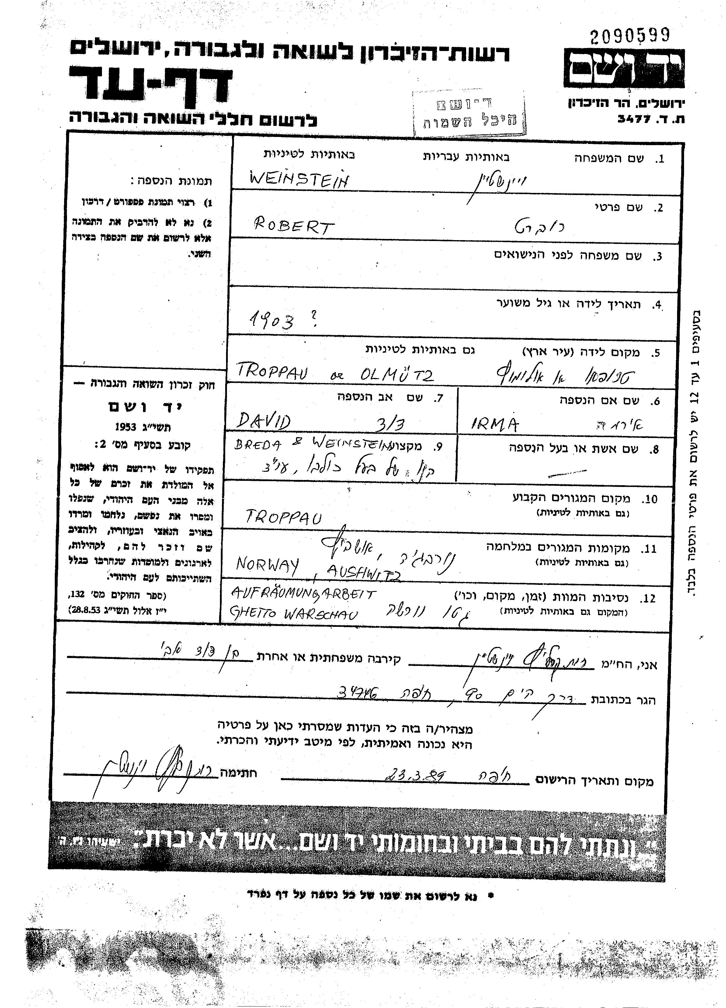 Weinstein Robert 1903 Troppau, Czechoslovakia Page of Testimony
