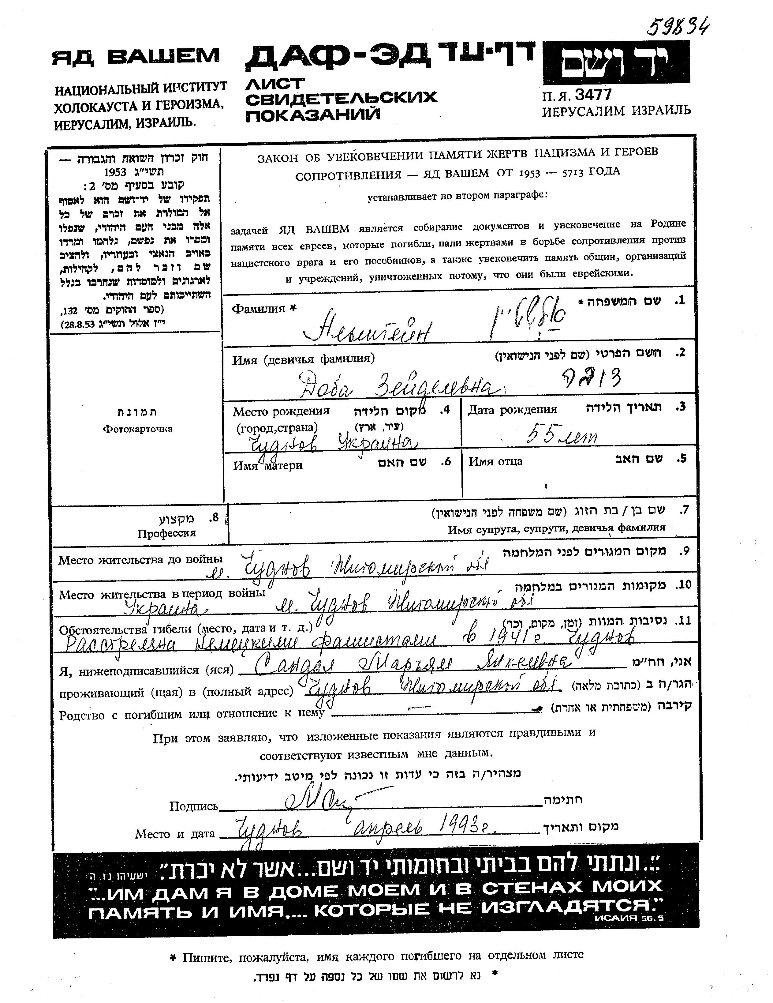 Doba Alshtein was born in Chudnov, Ukraine (USSR), 1886 to Zaidel. Prior to WWII she lived in Chudnov, Ukraine (USSR). During the war she was in Chudnov, Ukraine (USSR). Doba was murdered in the Shoah. Place of death: Chudnov, Ukraine (USSR), 1941.