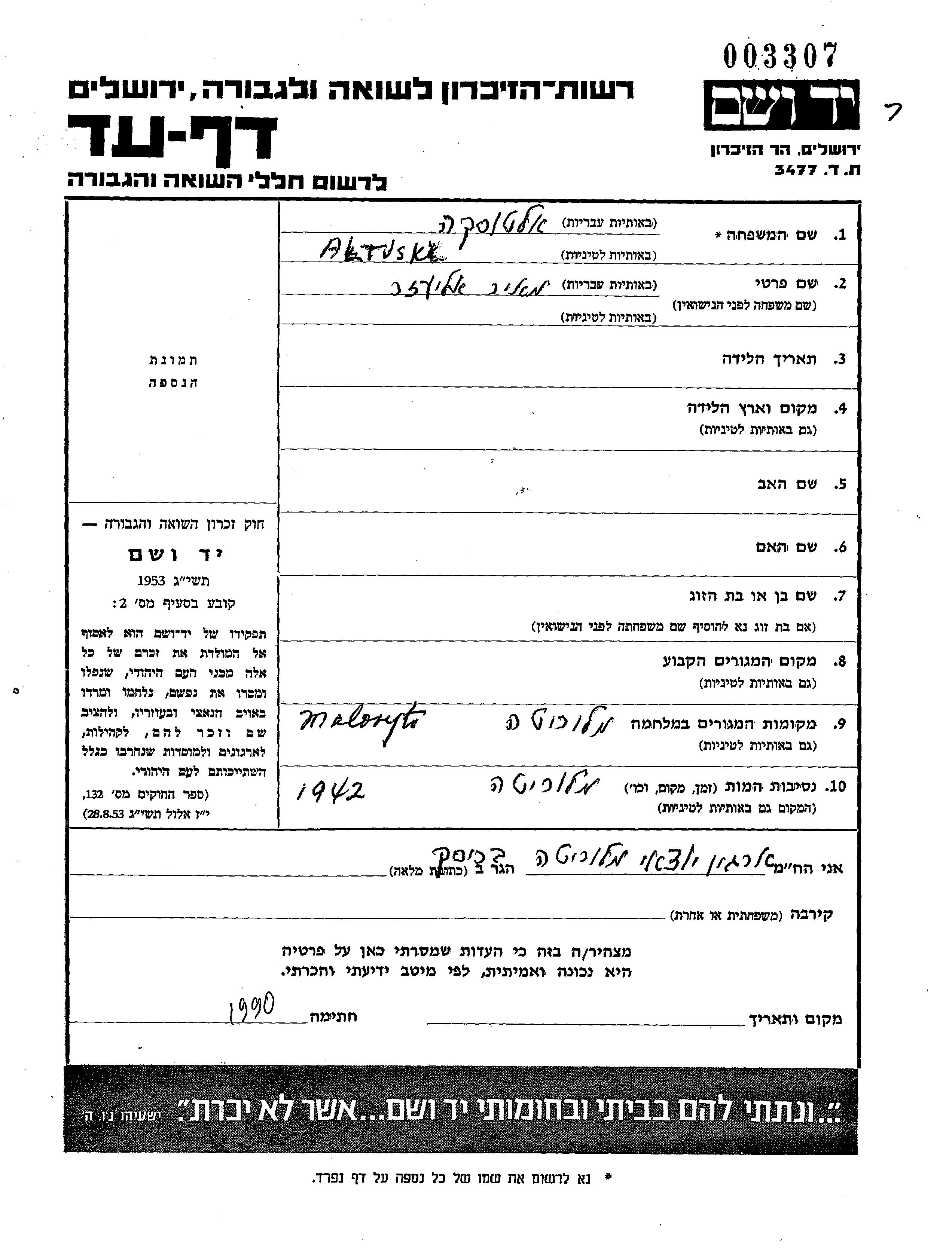 Altuski Meir Eliezer unstated place, Page of Testimony