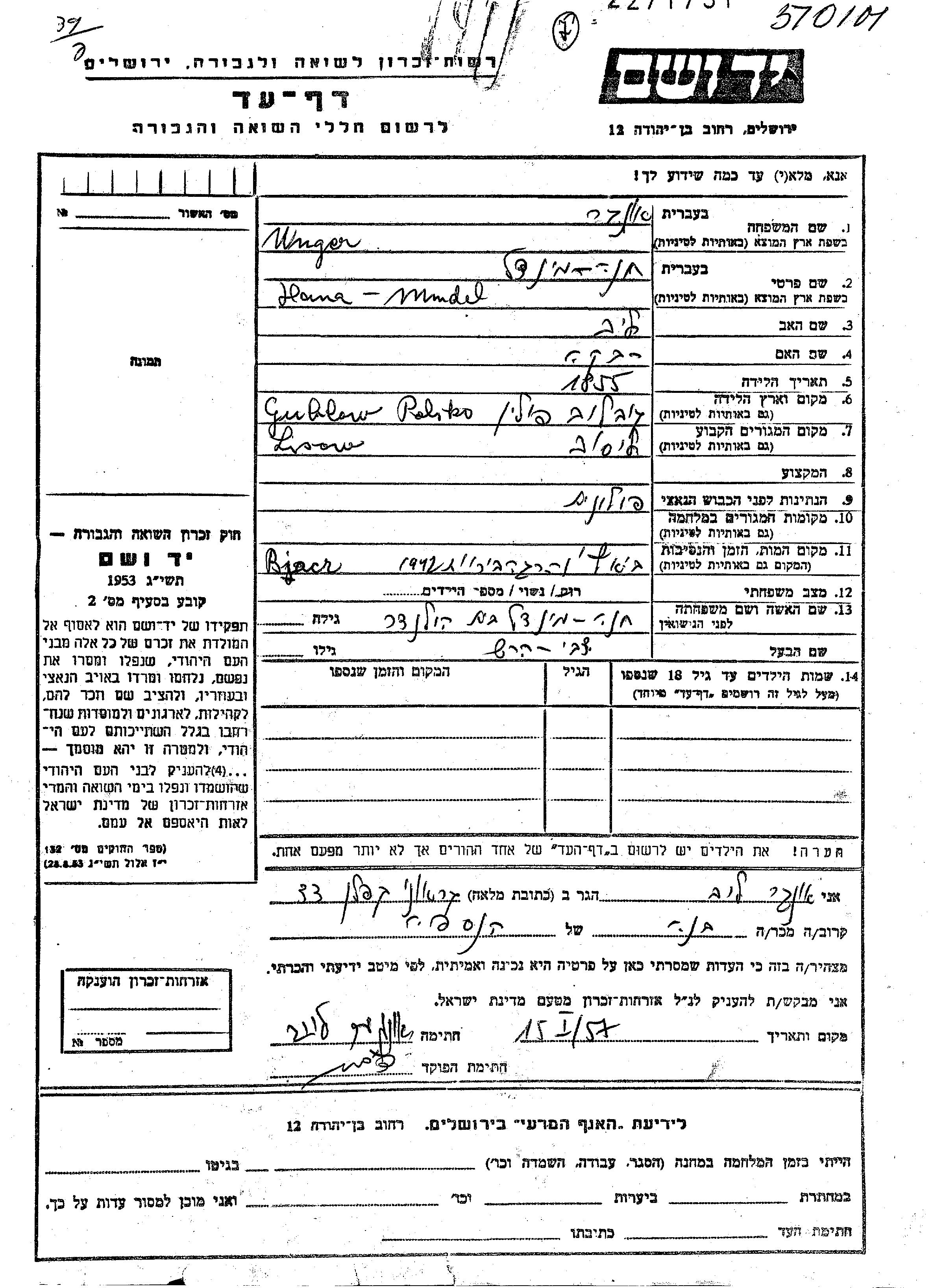 Hana Mindl Unger nee Holander was born in Gawlow, Poland, 1855 to Leib and Rivka. She was married to Tzvi Hersh. Prior to WWII she lived in Lisow, Poland. Hana Mindl was murdered in the Shoah. Place of death: Biecz, Poland, 1942.