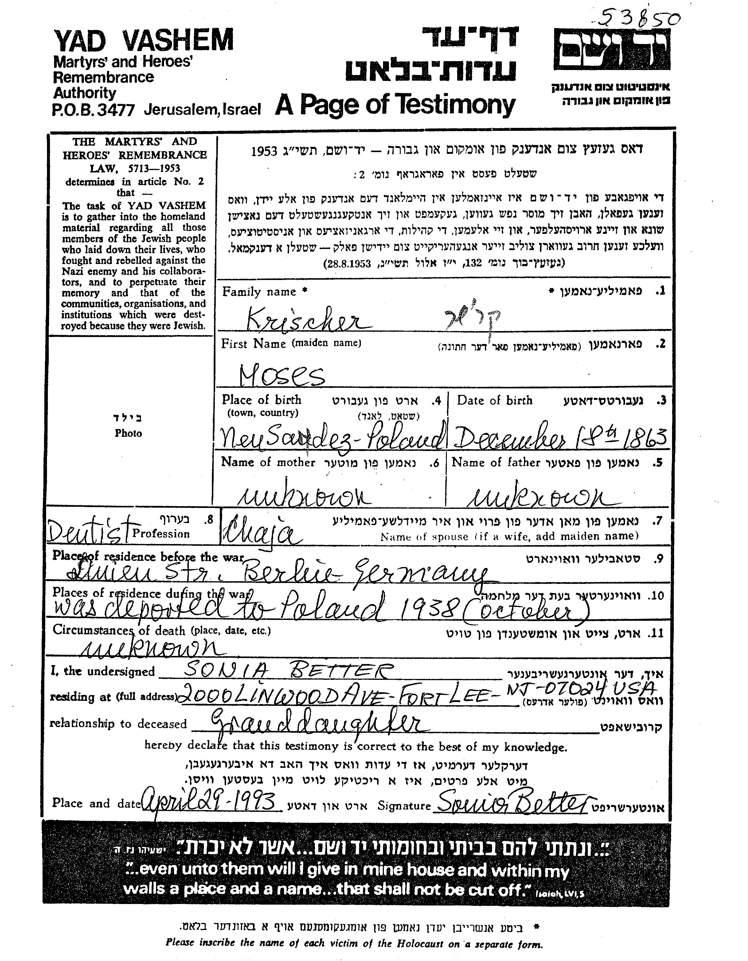 Moses Krischer was born in Neu Sandez, Poland, 1863. He was a dentist and married to Chaja. Prior to WWII he lived in Berlin, Germany. During the war he was in Poland.