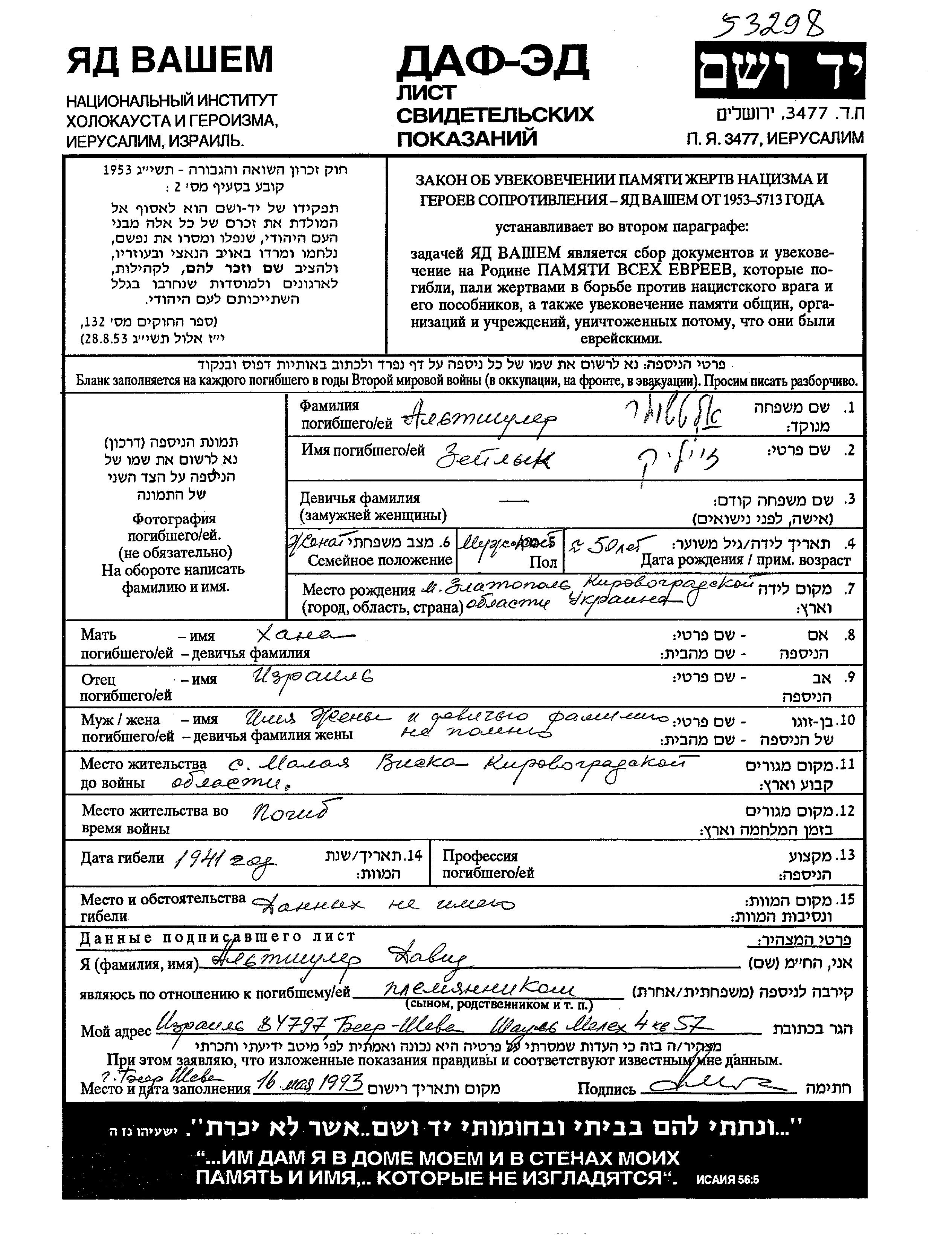 Zeilik Altshuler was born in Zlatopol, Ukraine (USSR) to Izrail and Khana. He was married. Prior to WWII he lived in Malaya Viska, Ukraine (USSR). Zeilik was murdered in the Shoah. Place of death: unknown, 1941.