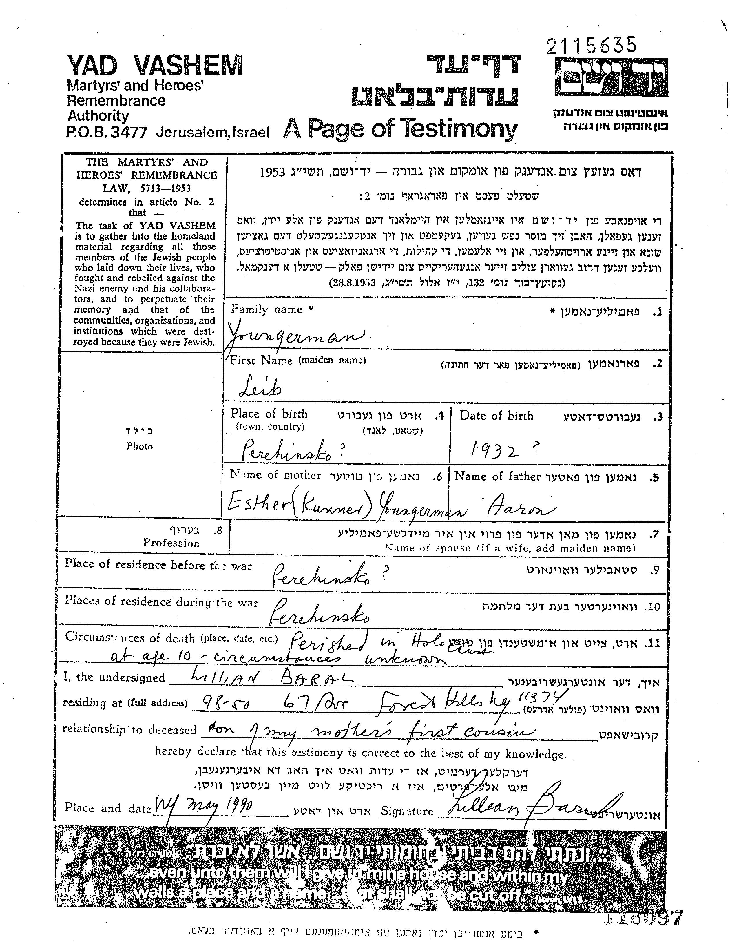 Youngerman Leib Perehinsko, Poland Page of Testimony