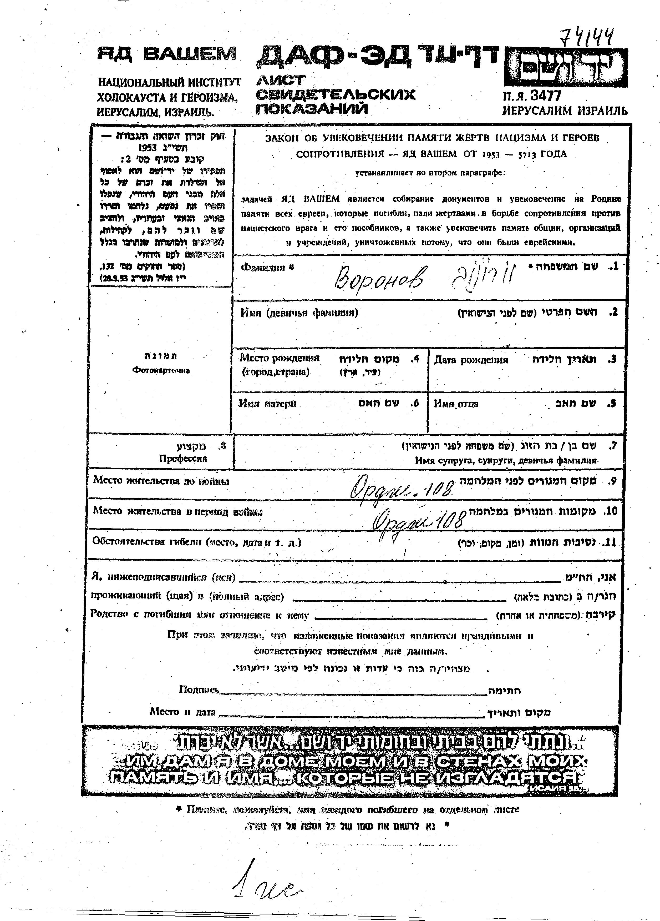 Voronov First name unknown Klintsy, Russia (USSR) Page of Testimony