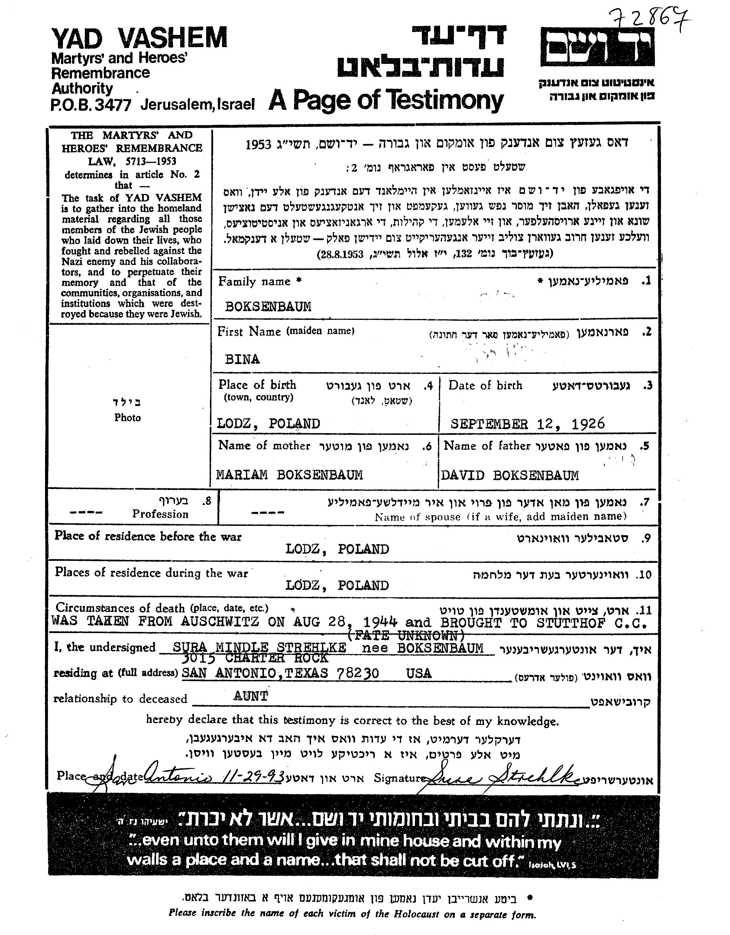 Boksenbaum Bina 1926 Lodz, Poland Page of Testimony