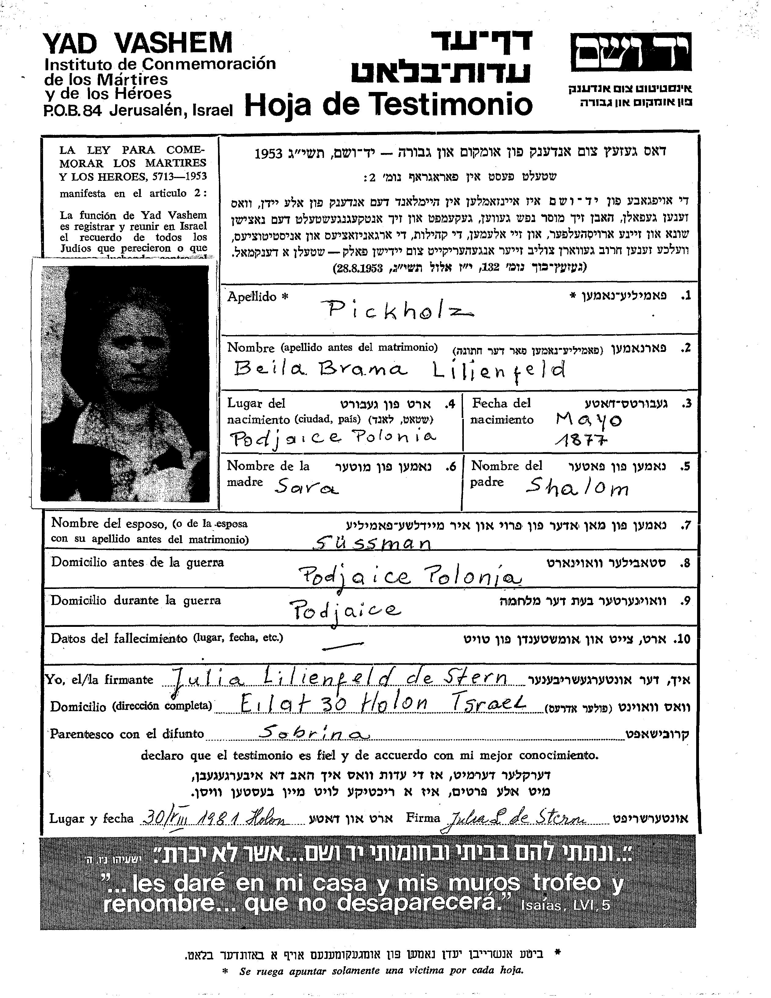 Beila Brana Pickholz nee Lilienfeld was born in Podhajce, Poland, 1877 to Shalom and Sara. She was married to Sussman. Prior to WWII she lived in Podhajce, Poland. During the war she was in Podhajce, Poland.