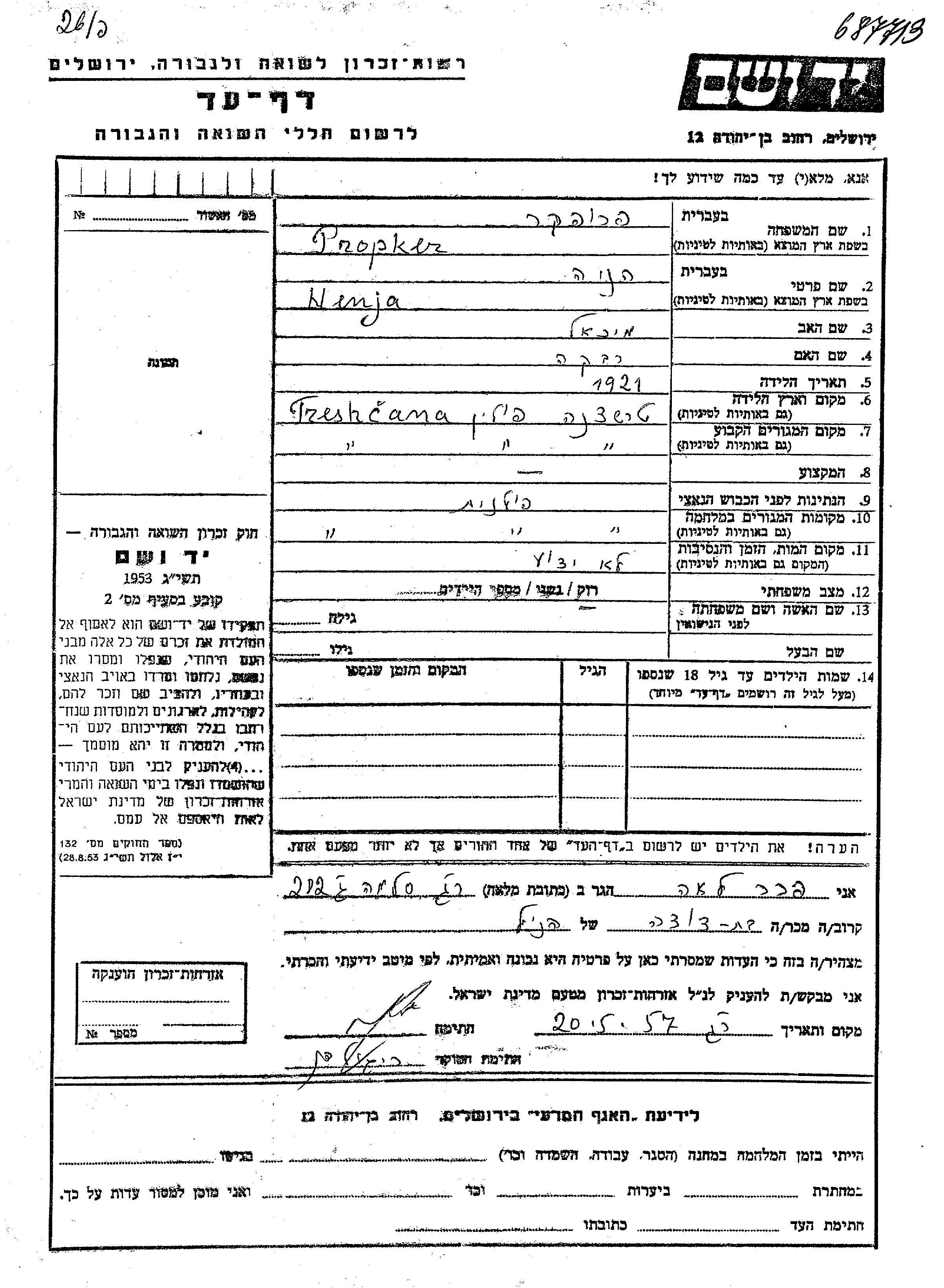 Henja Propker was born in Trzciana, Poland, 1921 to Mikhael and Rivka. She was single. Prior to WWII she lived in Trzciana, Poland. During the war she was in Trzciana, Poland. Henja was murdered in the Shoah.
