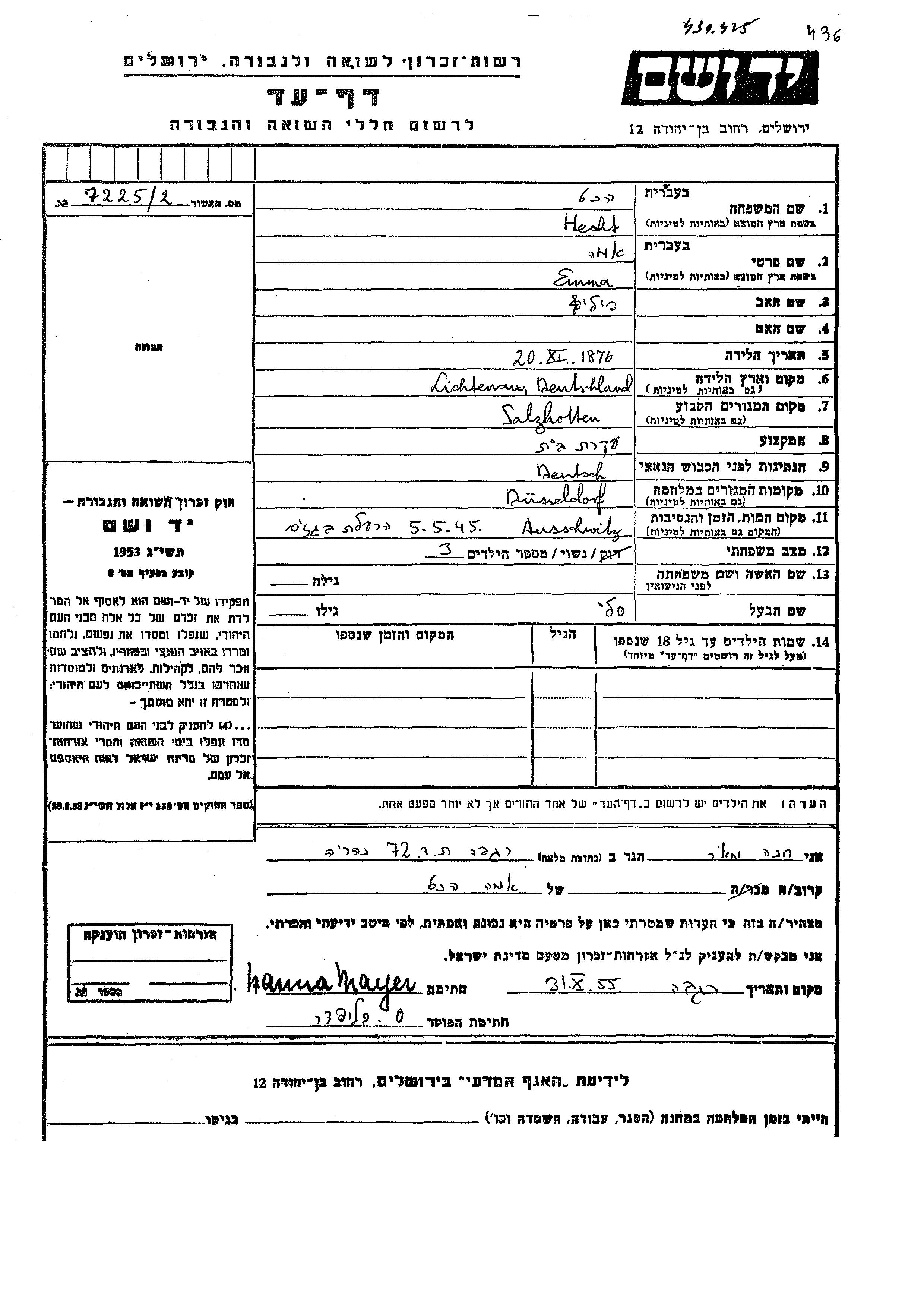 Emma Hecht was born in Lichtenau, Germany, 1876 to Filip. She was a housewife and married to Sali. Prior to WWII she lived in Salzkotten, Germany. During the war she was in Duesseldorf, Germany. Emma was murdered in the Shoah. Place of death: Auschwitz, Poland, 05/05/1945.