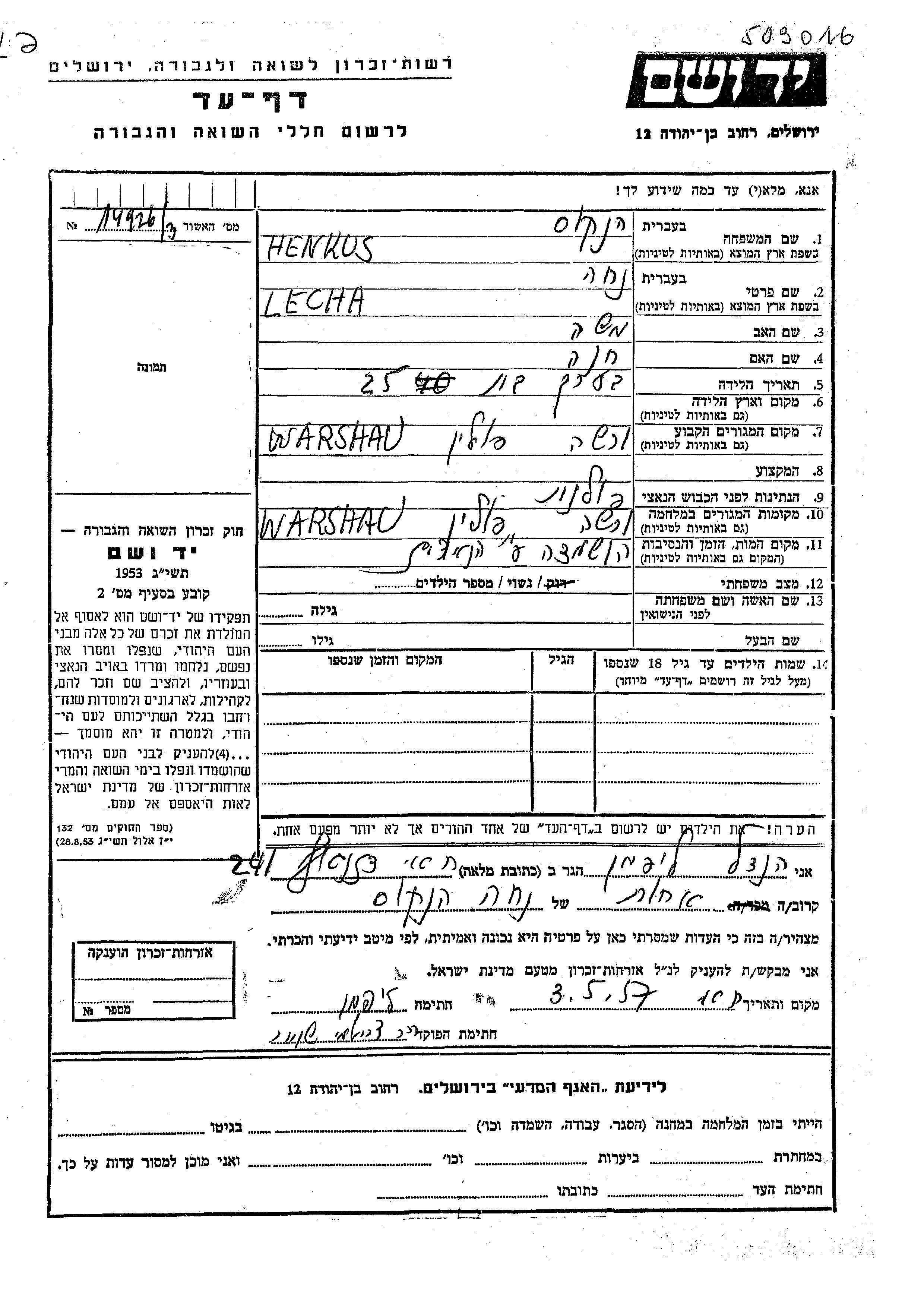 Henkus Lecha Nekha Warschau, Poland Page of Testimony