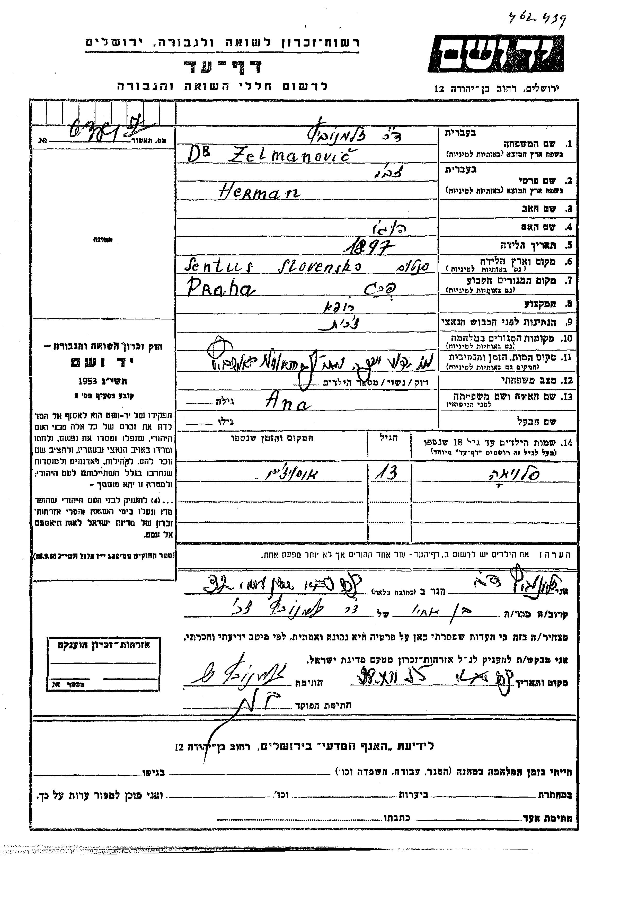 Zelmanovic Herman Zavu 1897 Prague, Czechoslovakia Page of Testimony