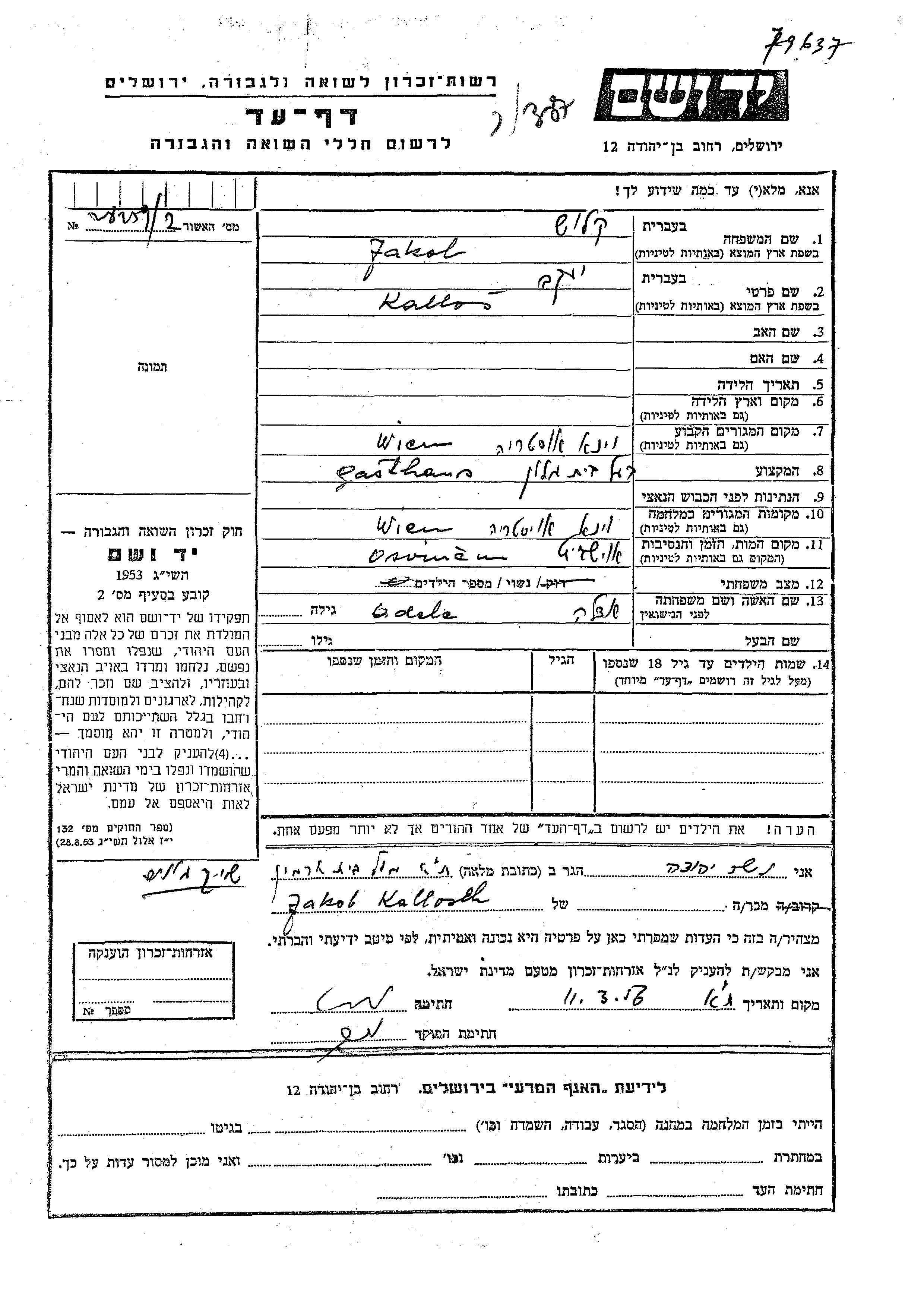 Jakob Kallos. He was a hotel owner and married to Adela. Prior to WWII he lived in Wien, Austria. During the war he was in Wien, Austria. Jakob was murdered in the Shoah. Place of death: Auschwitz, Poland.