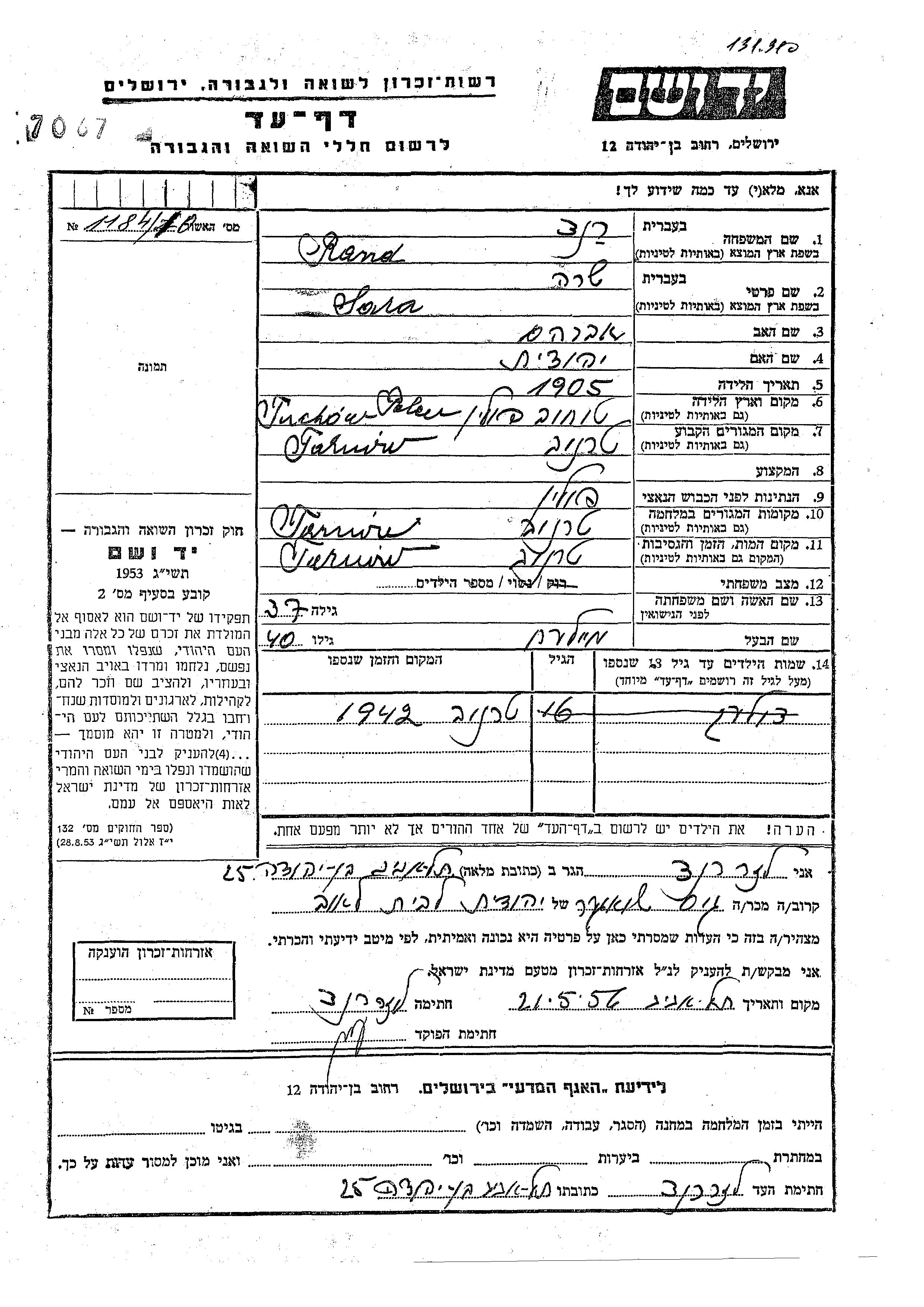 Rand Sara 1905 Tarnuv, Poland Page of Testimony