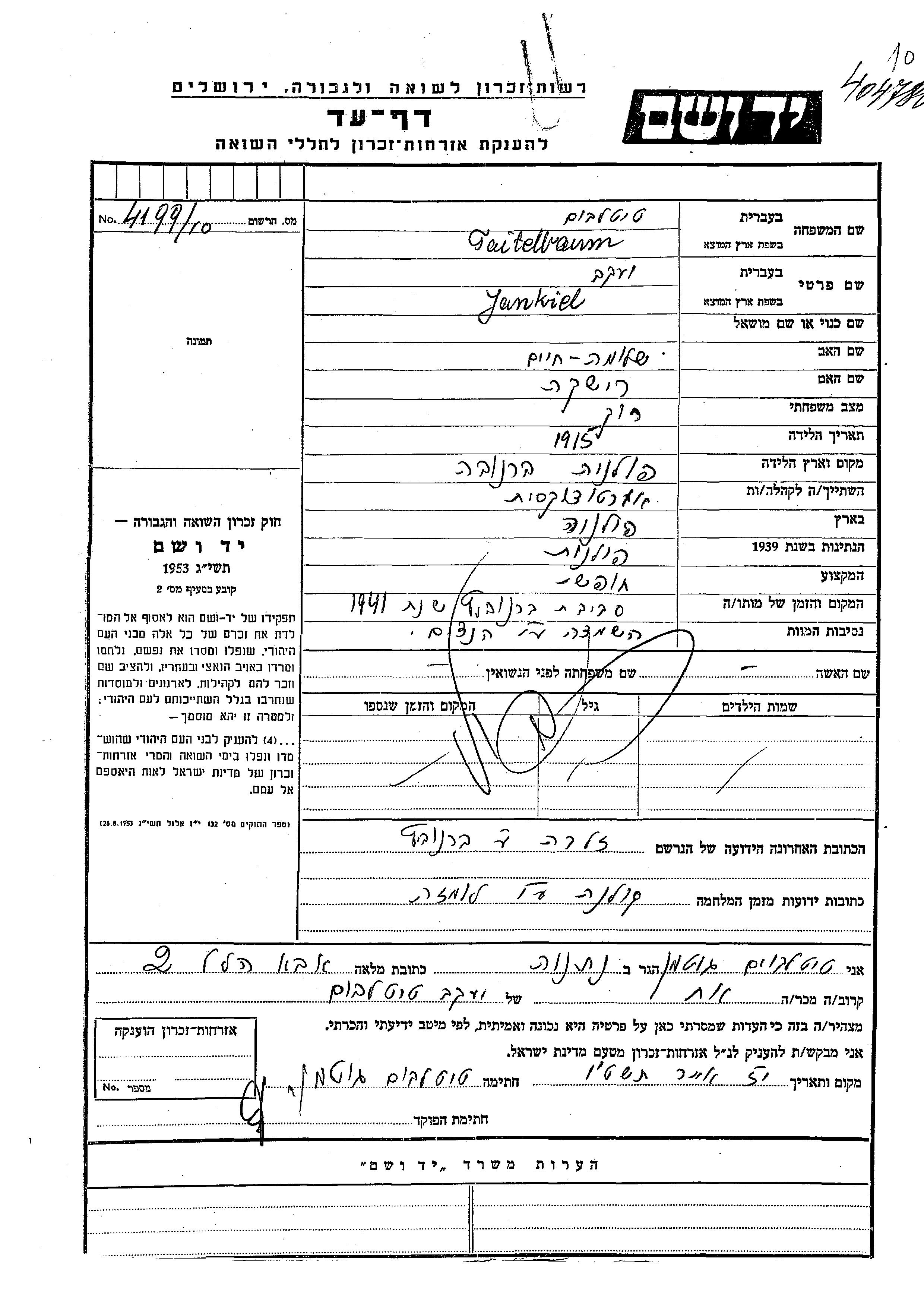 Jankiel Taitelbaum was born in Baranowo, Poland, 1915 to Shlomo Khaim and Rishka. He was a liberal profession and single. Prior to WWII he lived in Poland. During the war he was in Kolno, Poland. Jankiel was murdered in the Shoah. Place of death: Baranowicze, Poland, 1941.