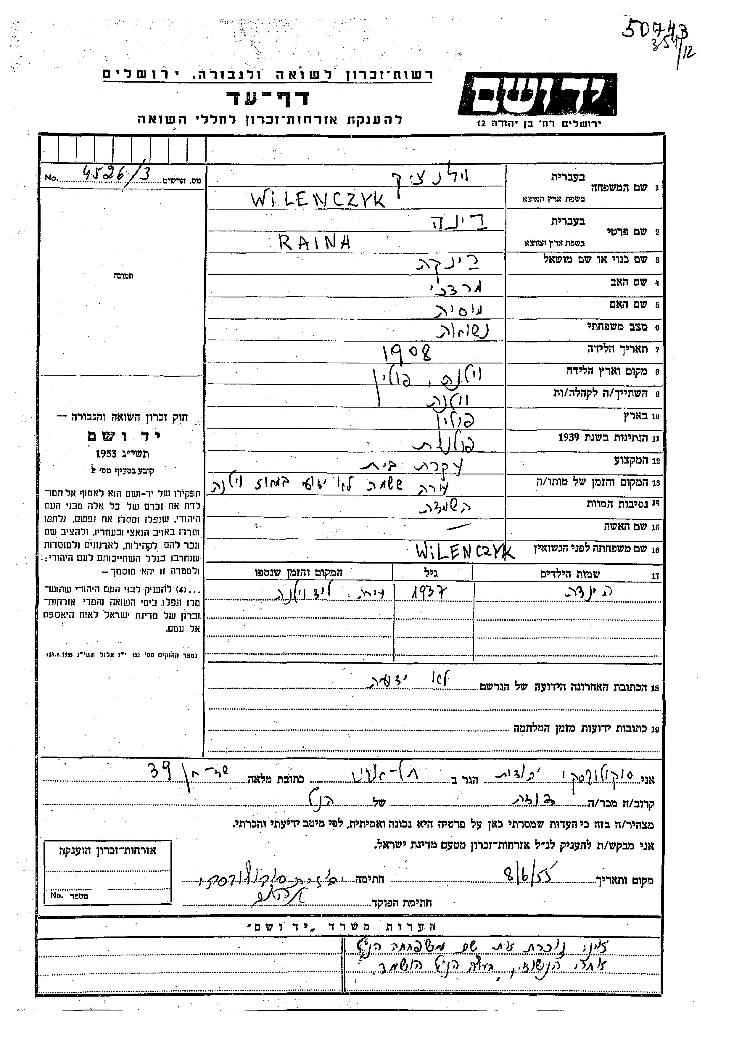 Wilenczyk Raina Rina 1908 unstated place, Page of Testimony