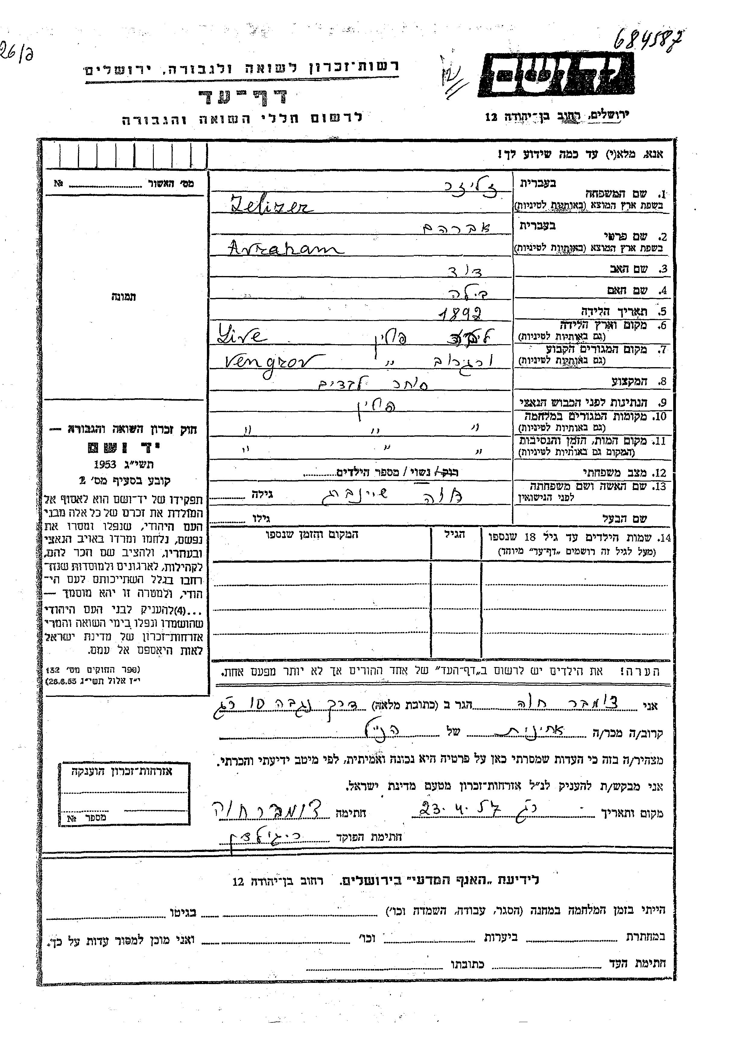 Avraham Zelizer was born in Live, Poland, 1892 to David and Bila. He was a textile merchant and married to Roza nee Sheinberg. Prior to WWII he lived in Wengrow, Poland. During the war he was in Wengrow, Poland. Avraham was murdered in the Shoah. Place of death: Wengrow, Poland.