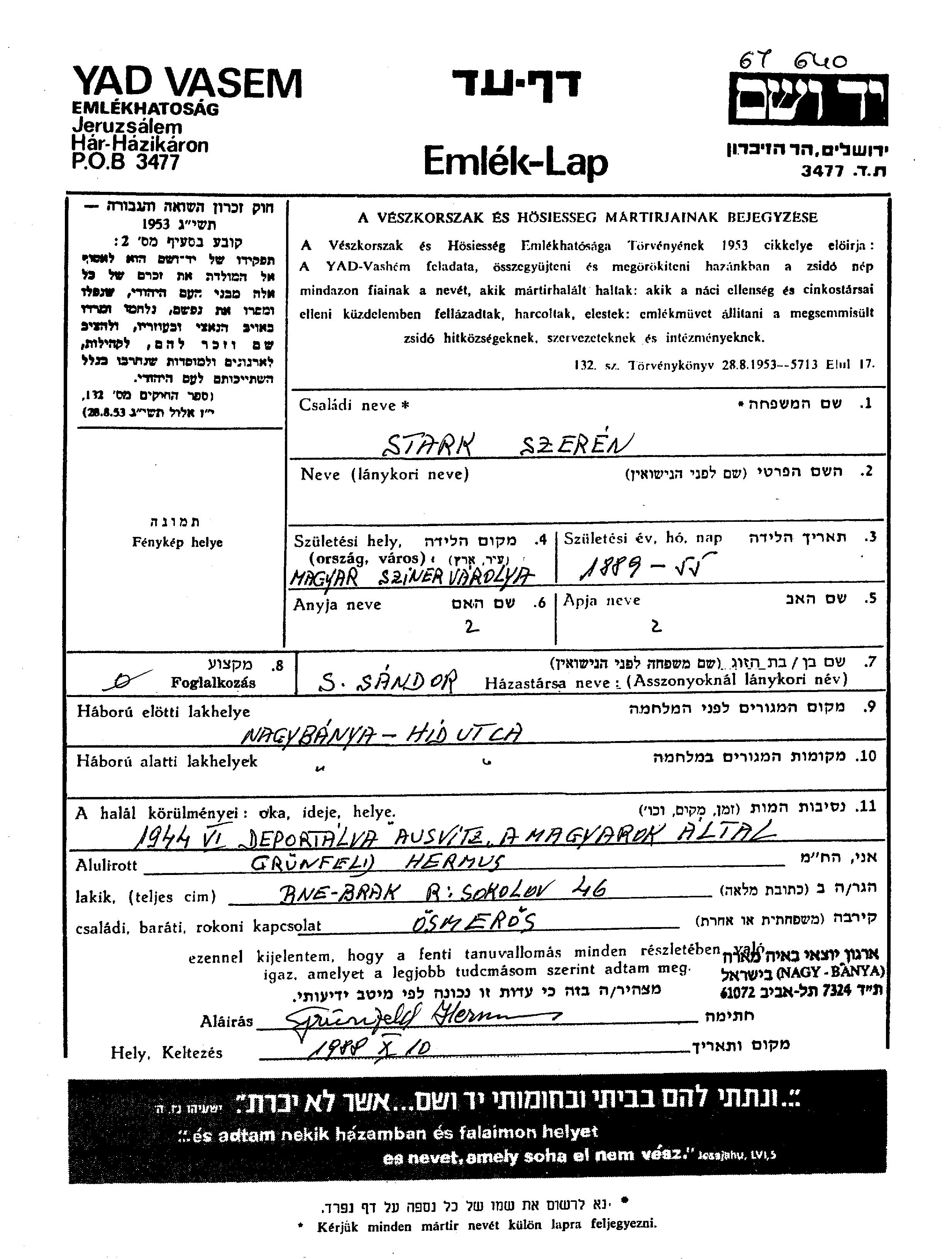 | Stark | Szeren | 1889 | Nagybánya, Romania | Page of Testimony |
