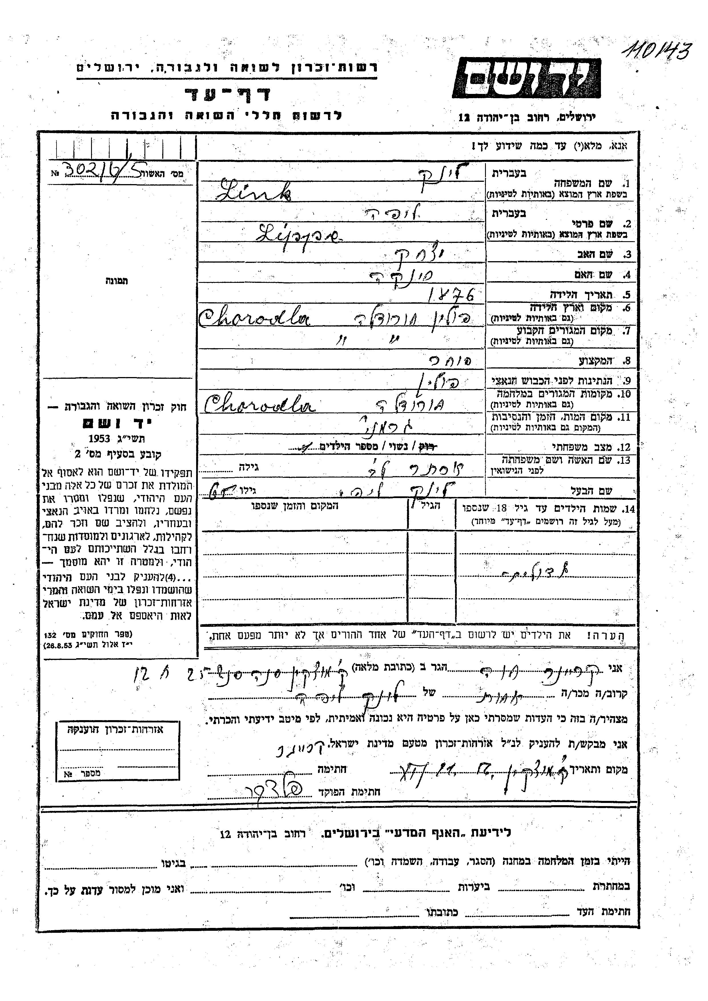 Lippe Link was born in Horodlo, Poland, 1876 to Yitzkhak and Khinka. He was a merchant and married to Ester nee Lev. During the war he was in Horodlo, Poland.