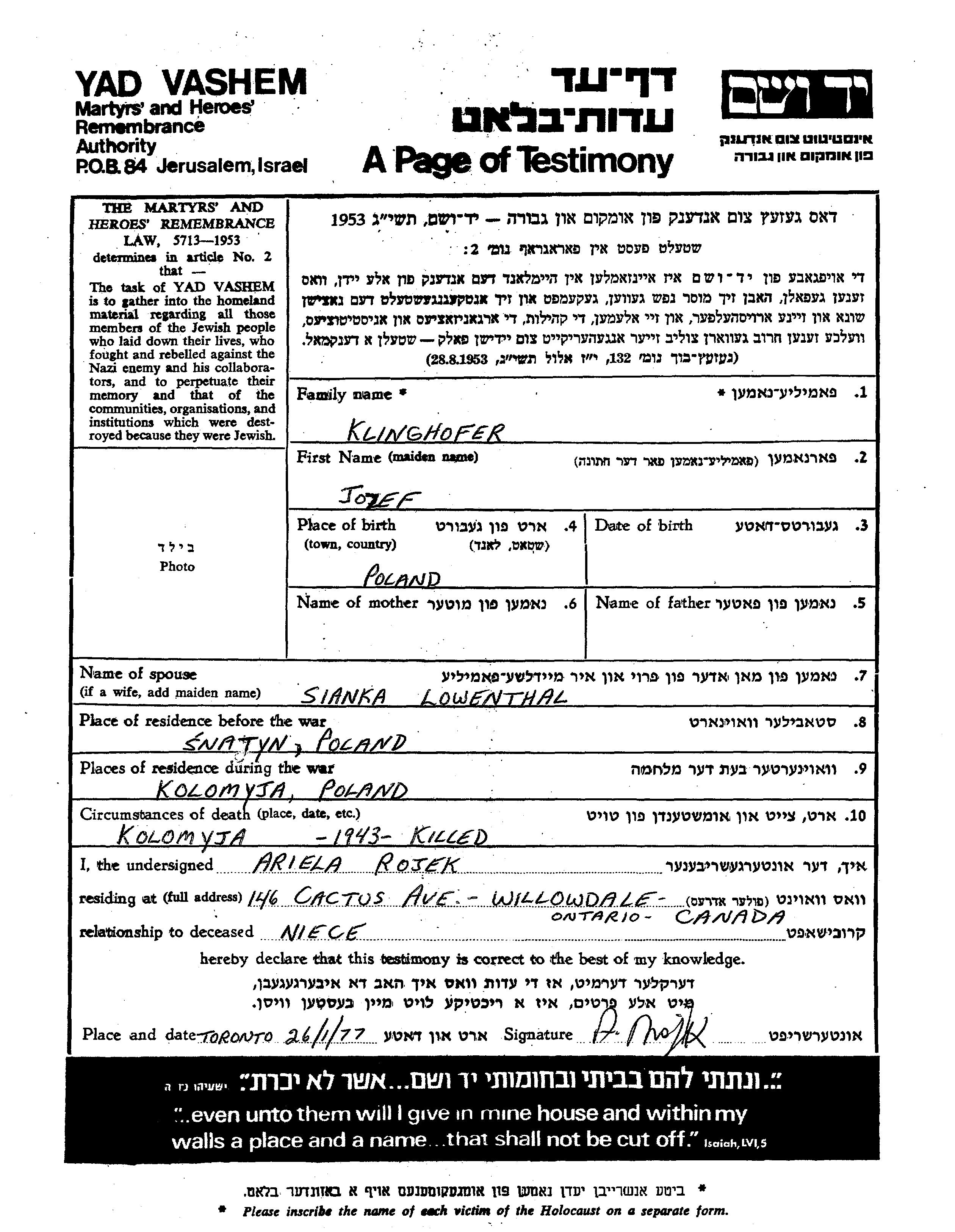 Klinghofer Jozef Snatyn, Poland Page of Testimony