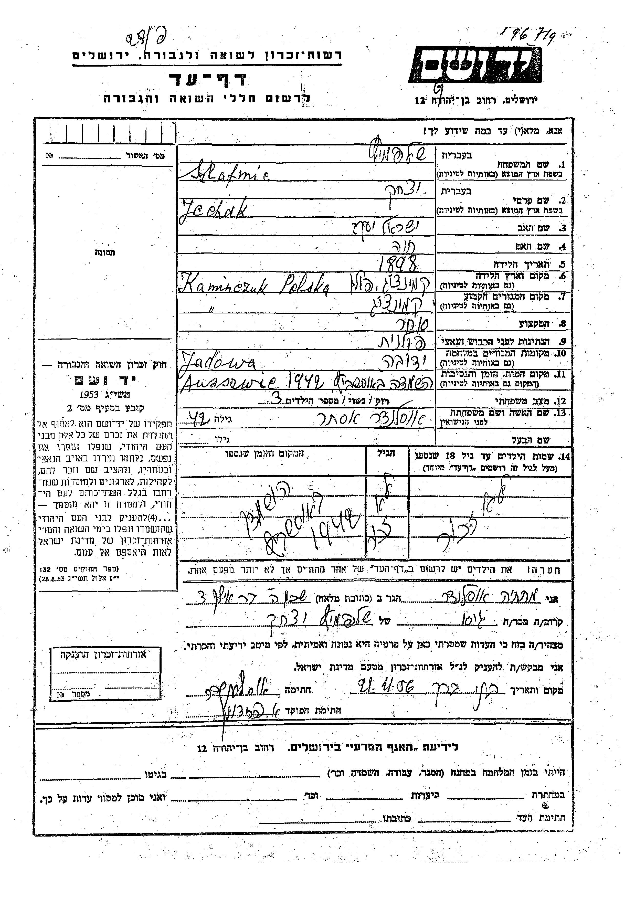 Jcchak Szlafmic was born in KAMIENCZYK NAD BUGIEM, Poland, 1898 to Yisrael Yaakov and Khava. He was a merchant and married to Ester nee Auslender. Prior to WWII he lived in KAMIENCZYK NAD BUGIEM, Poland. During the war he was in Jadow, Poland. Jcchak was murdered in the Shoah. Place of death: Auschwitz Birkenau, Poland, 1942.
