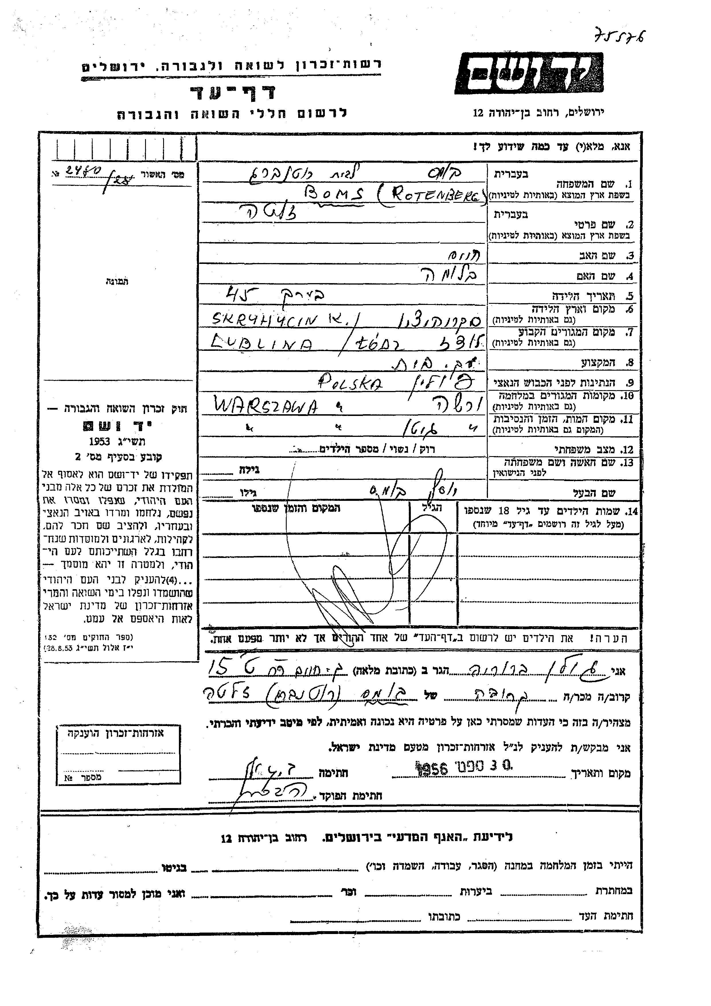 Zlata Boms nee Rutenberg was born in Skryhiczyn, Poland to Khaim and Bluma. She was a housewife and married to Yosef. Prior to WWII she lived in Lublin, Poland. During the war she was in Warszawa, Poland. Zlata was murdered in the Shoah. Place of death: Warszawa, Poland.
