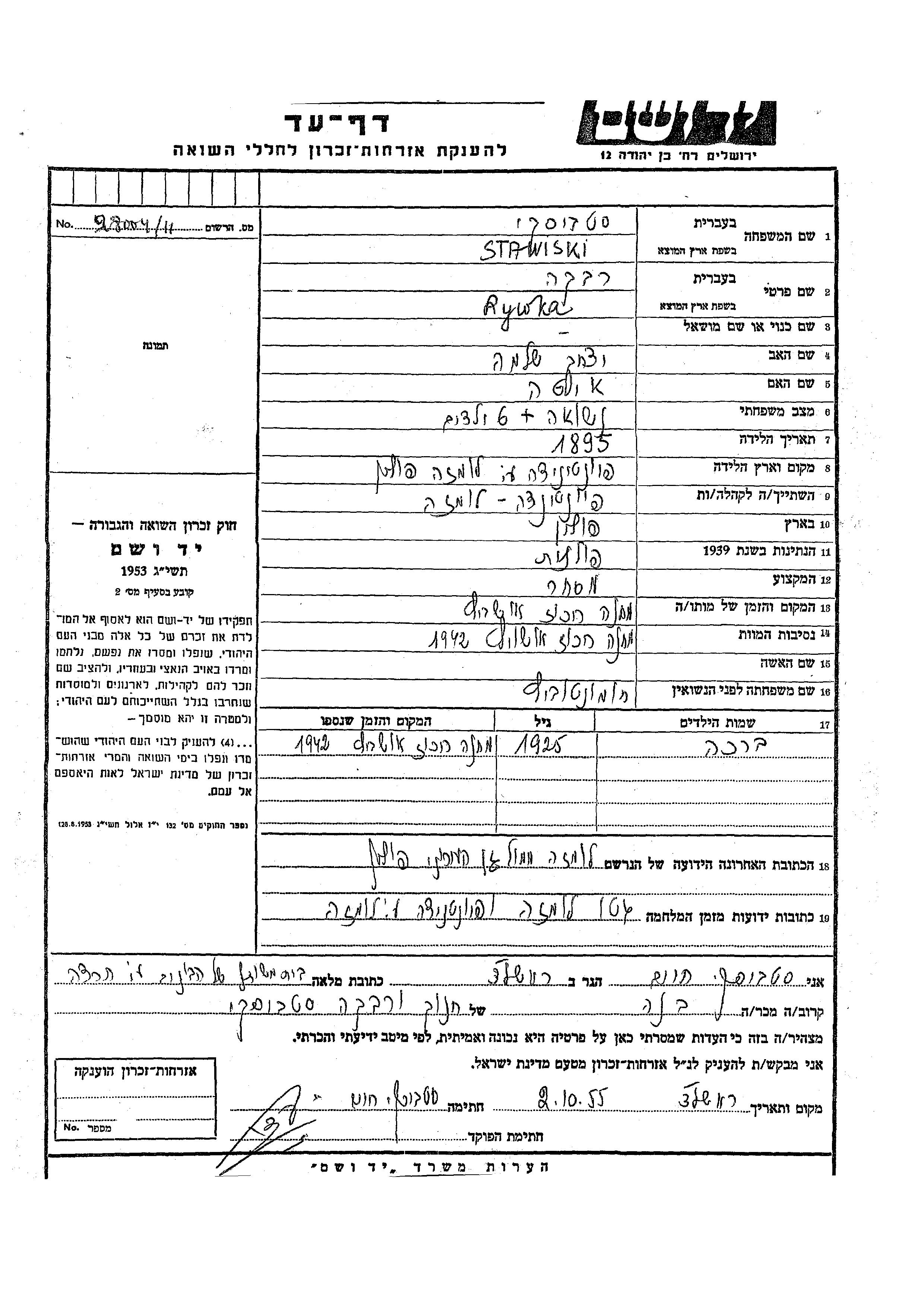 Rywka Stawiski nee Khomentovitz was born in Piatnica, Poland, 1895 to Yitzkhak Shlomo and Ita. She was a merchant and married. Prior to WWII she lived in Piatnica, Poland. During the war she was in Łomża, Poland. Rywka was murdered in the Shoah. Place of death: Auschwitz, Poland, 1942.