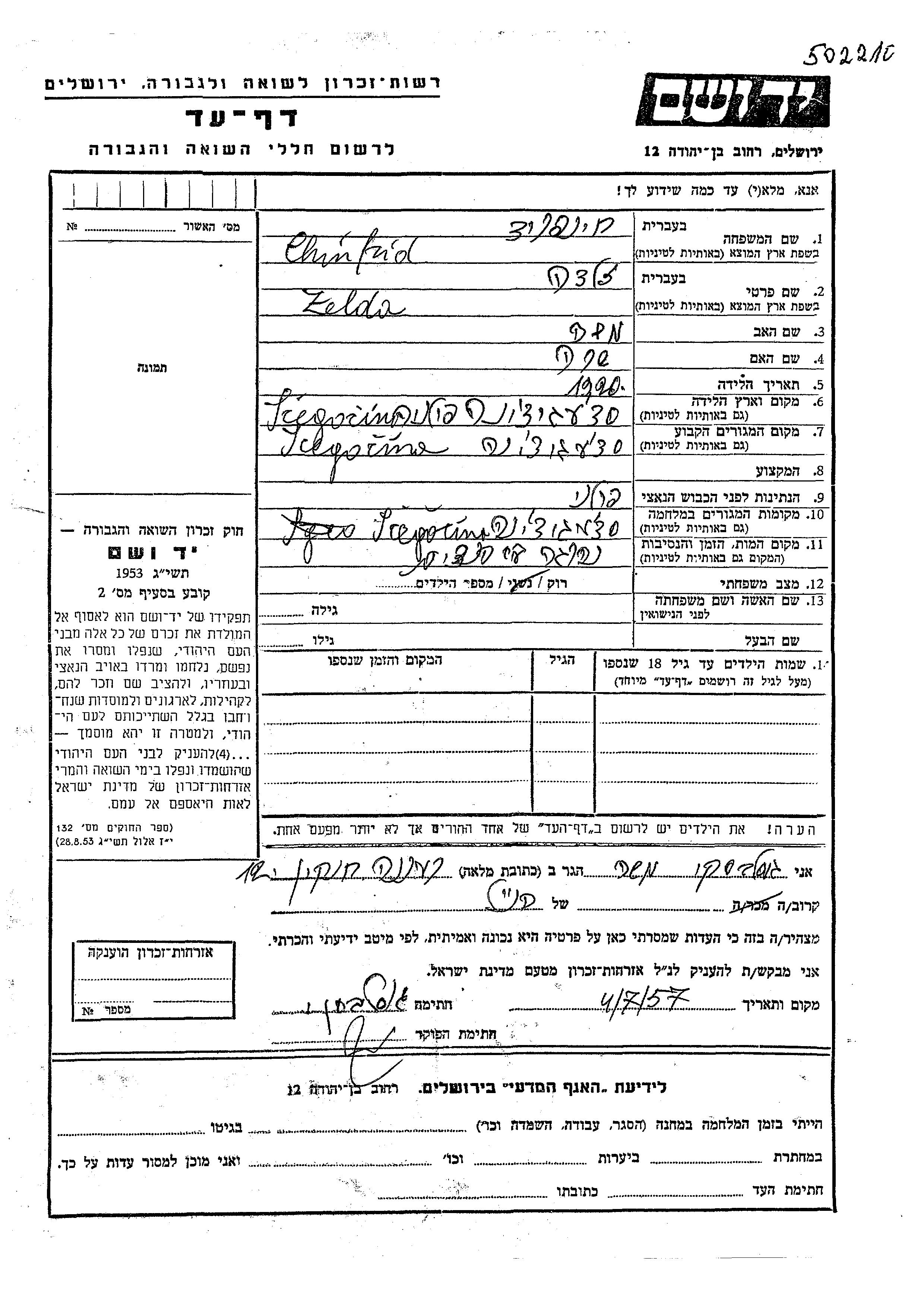 Zelda Chinfrid was born in Strzegocin, Poland, 1920 to Moshe and Sara. She was single. Prior to WWII she lived in Strzegocin, Poland. During the war she was in Strzegocin, Poland. Zelda was murdered in the Shoah.