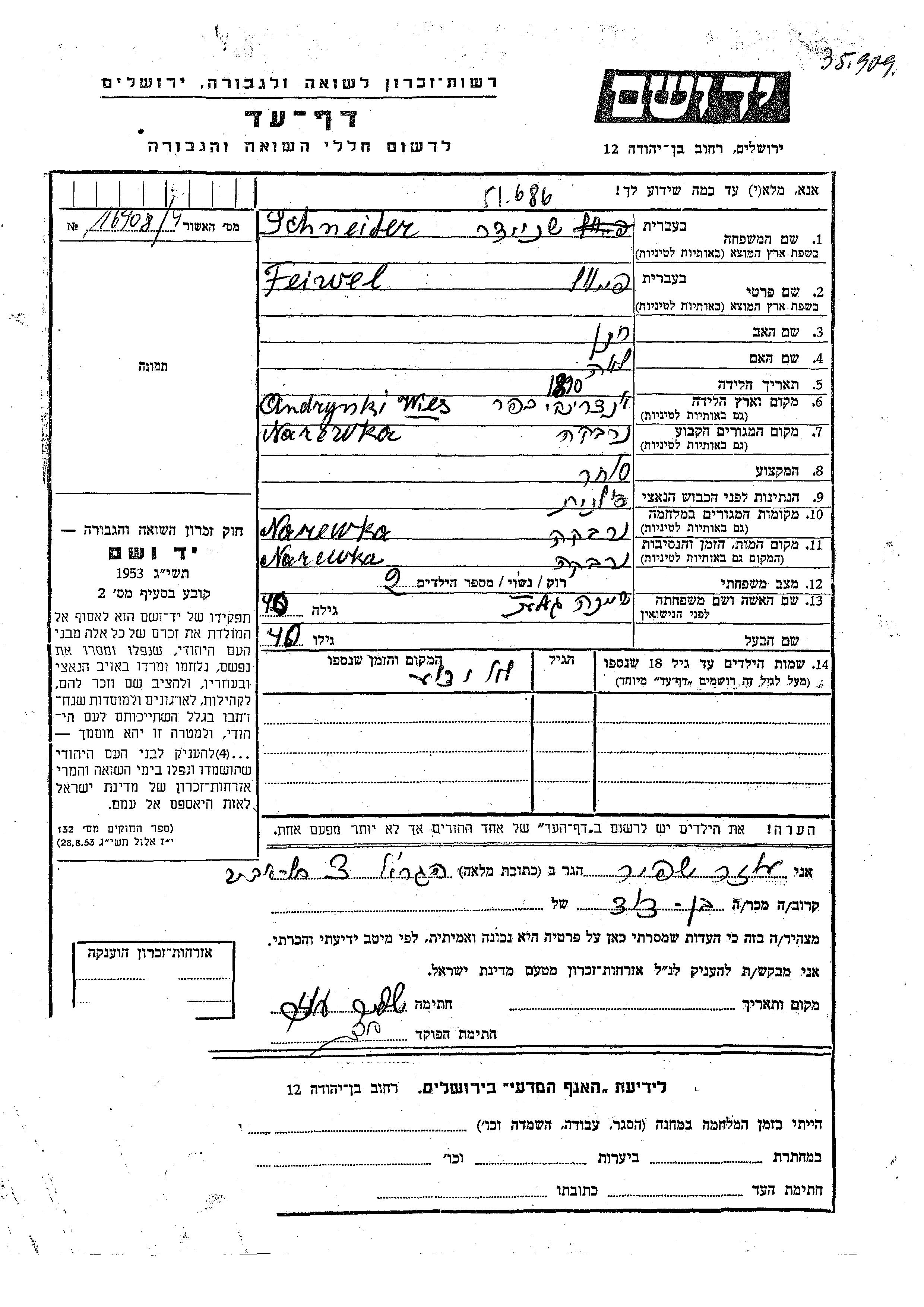 Schneider Feiwel 1890 Narewka, Poland Page of Testimony