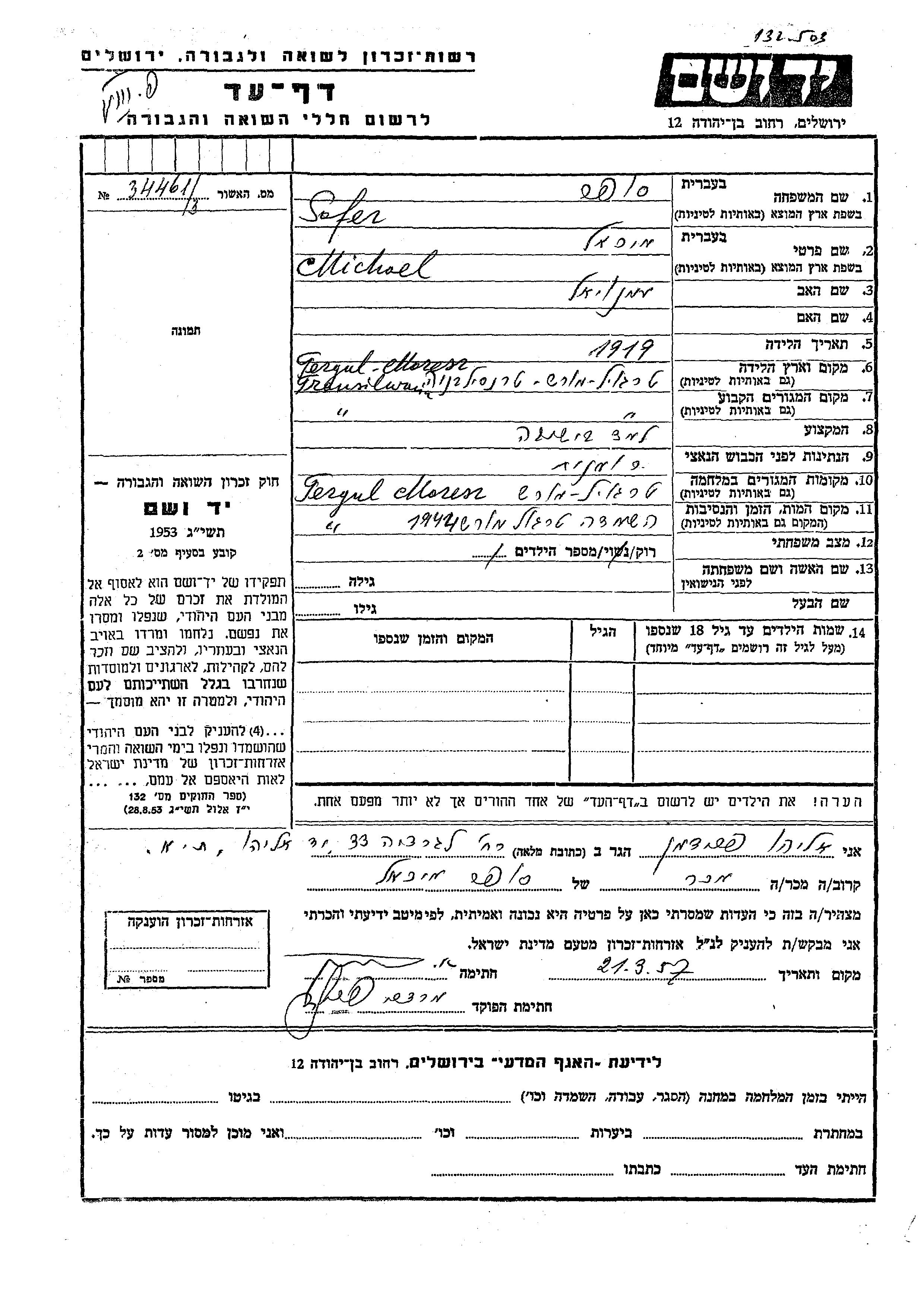 Michael Sofer was born in Targu Mures, Romania, 1919 to Emanuel. He was a yeshiva student and single. Prior to WWII he lived in Targu Mures, Romania. During the war he was in Targu Mures, Romania. Michael was murdered in the Shoah. Place of death: Targu Mures, Romania, 1944.