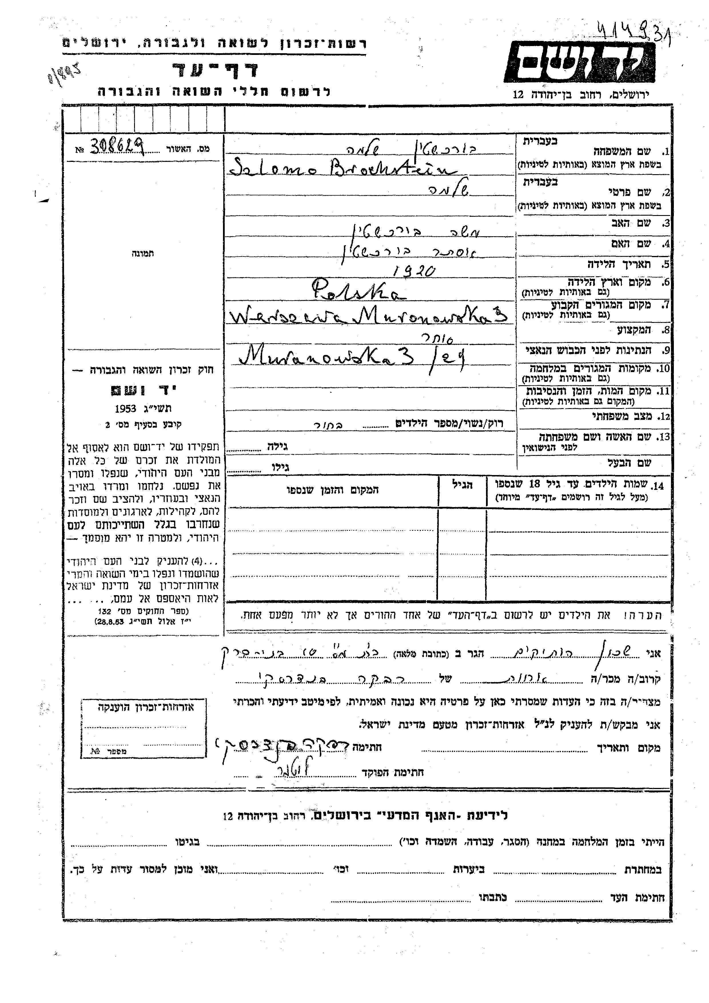 Brochstein Borkhshtein Szlomo 1920 Warszawa, Poland Page of Testimony