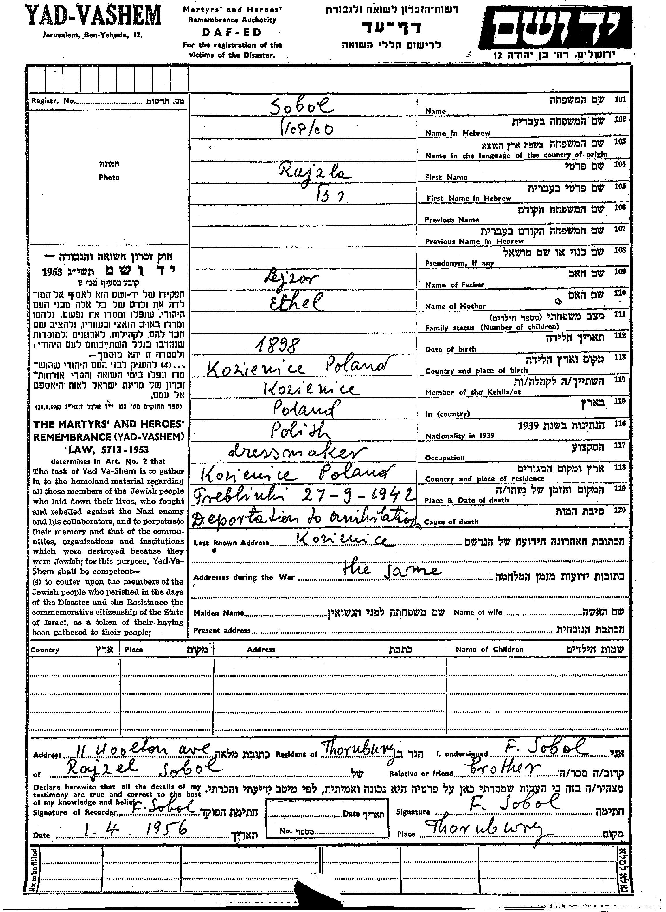 Rajzla Sobol was born in Kosienice, Poland, 1898 to Lejzor and Ethel. She was a seamstress. Prior to WWII she lived in Kosienice, Poland. During the war she was in Kosienice, Poland. Rajzla was murdered in the Shoah. Place of death: Treblinka, Poland, 1942.