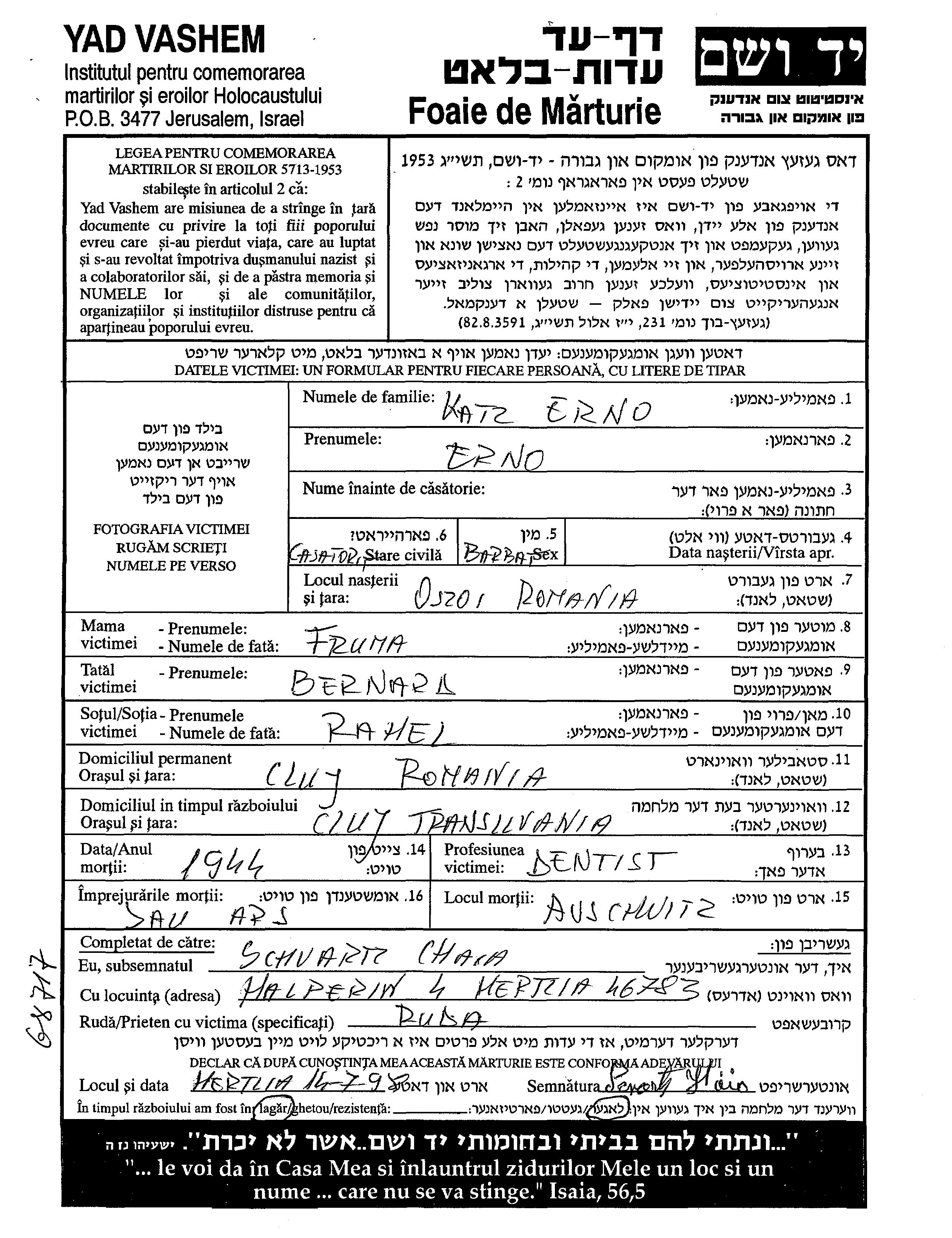 Erno Katz was born in Oszoi, Romania to Bernard and Fruma. He was a dentist and married to Rahel. Prior to WWII he lived in Cluj, Romania. During the war he was in Cluj, Romania.
