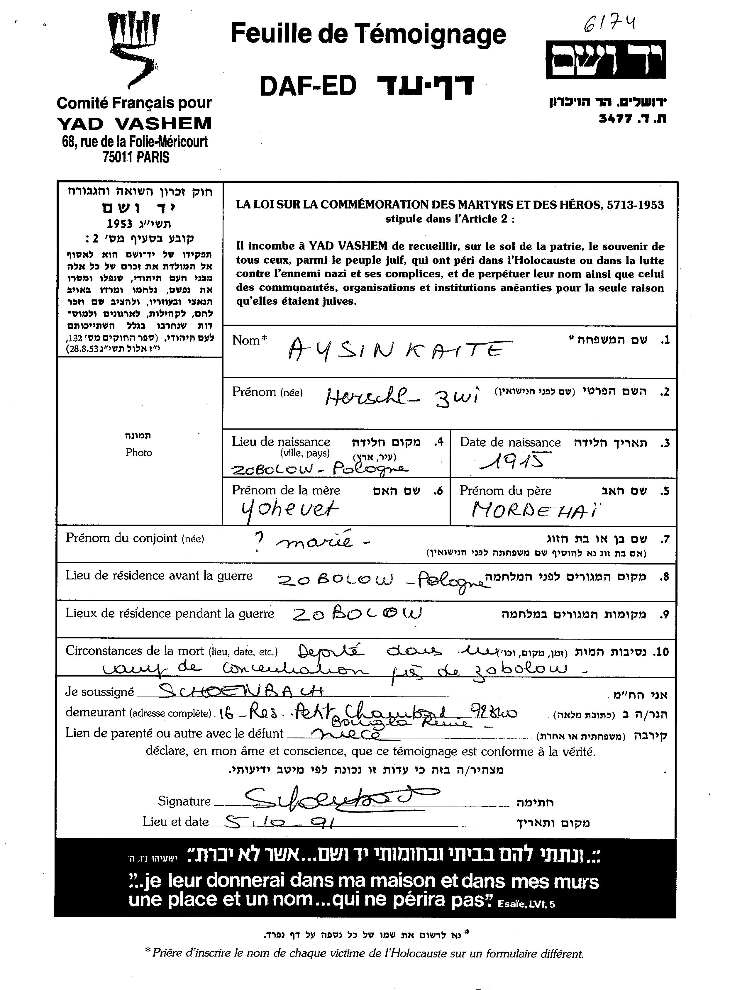 Hershl Zwi Aysinkaite was born in Sobolow, Poland, 1915 to Mordehai and Yohevet nee Ziemlich. He was married. Prior to WWII he lived in Sobolow, Poland. During the war he was in Sobolow, Poland. Hershl Zwi was murdered in the Shoah.