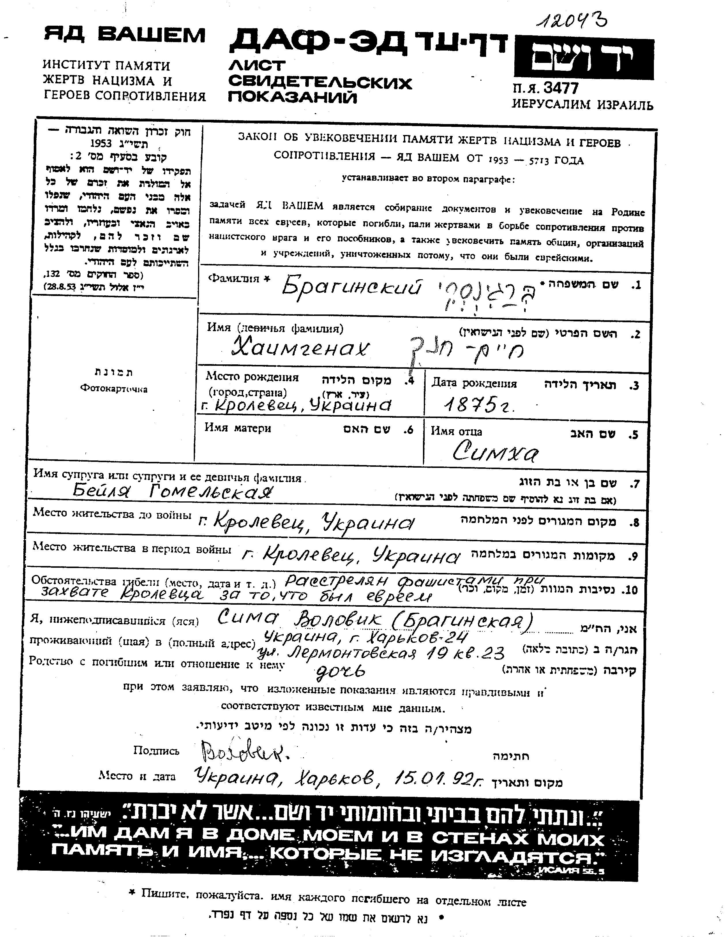 Genakh Khaim Braginski Berginski was born in Krolevets, Ukraine (USSR), 1875 to Simkha. He was married to Beilia. Prior to WWII he lived in Krolevets, Ukraine (USSR). During the war he was in Krolevets, Ukraine (USSR). Genakh Khaim was murdered in the Shoah. Place of death: Krolevets, Ukraine (USSR).