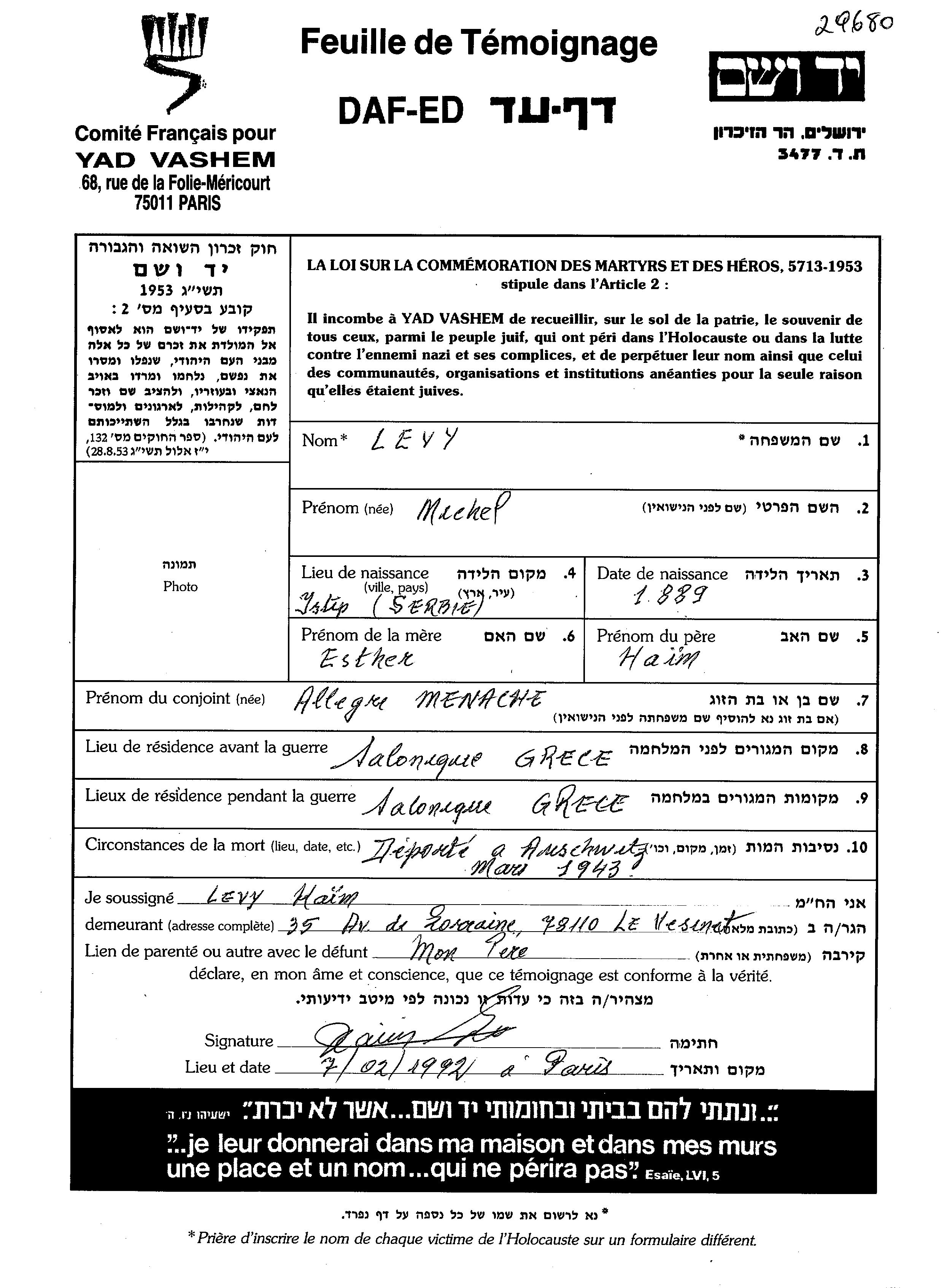 Levy Michel 1889 Saloniki, Greece Page of Testimony