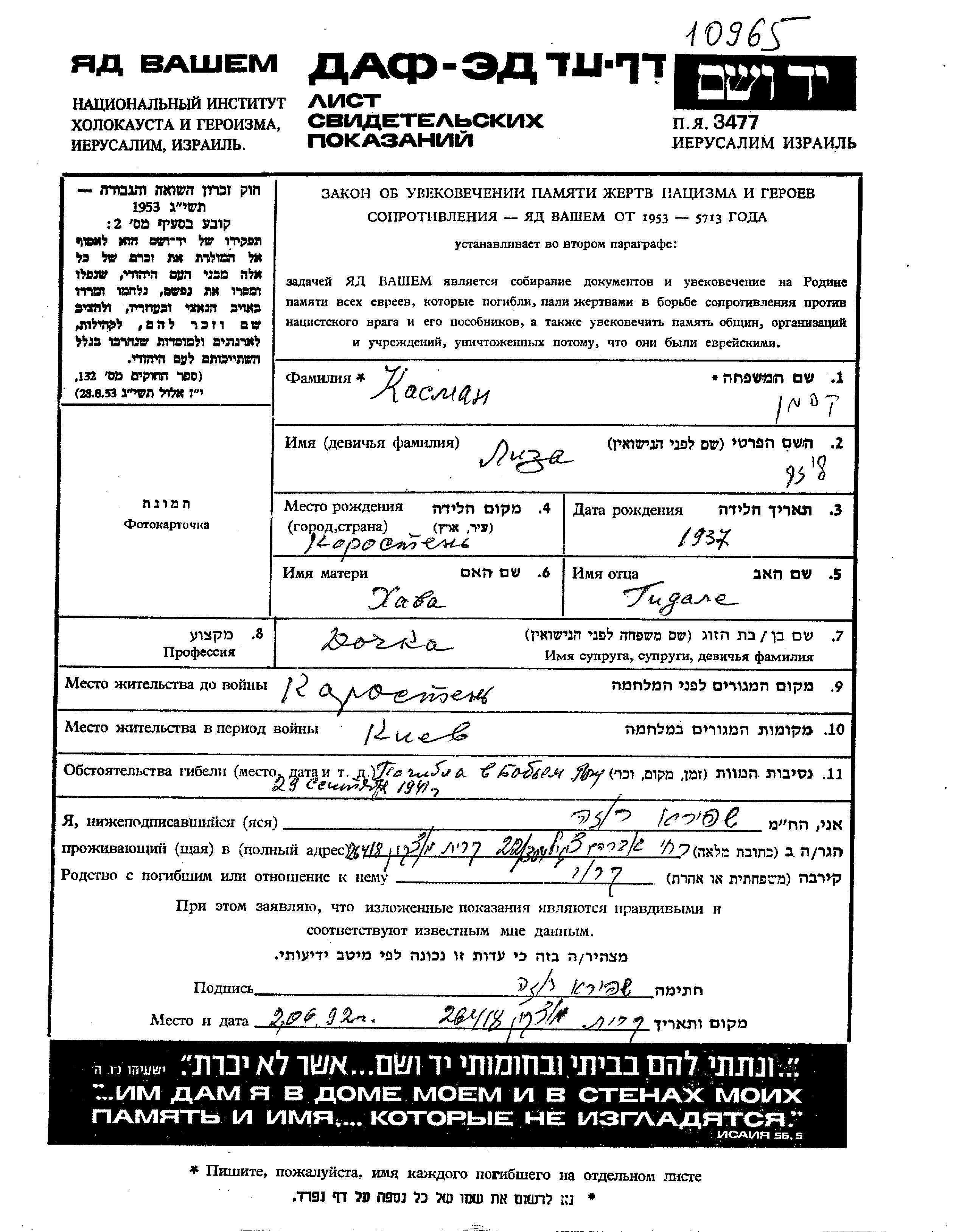 Kesman Liza 1937 Korosten, Ukraine (USSR) Page of Testimony