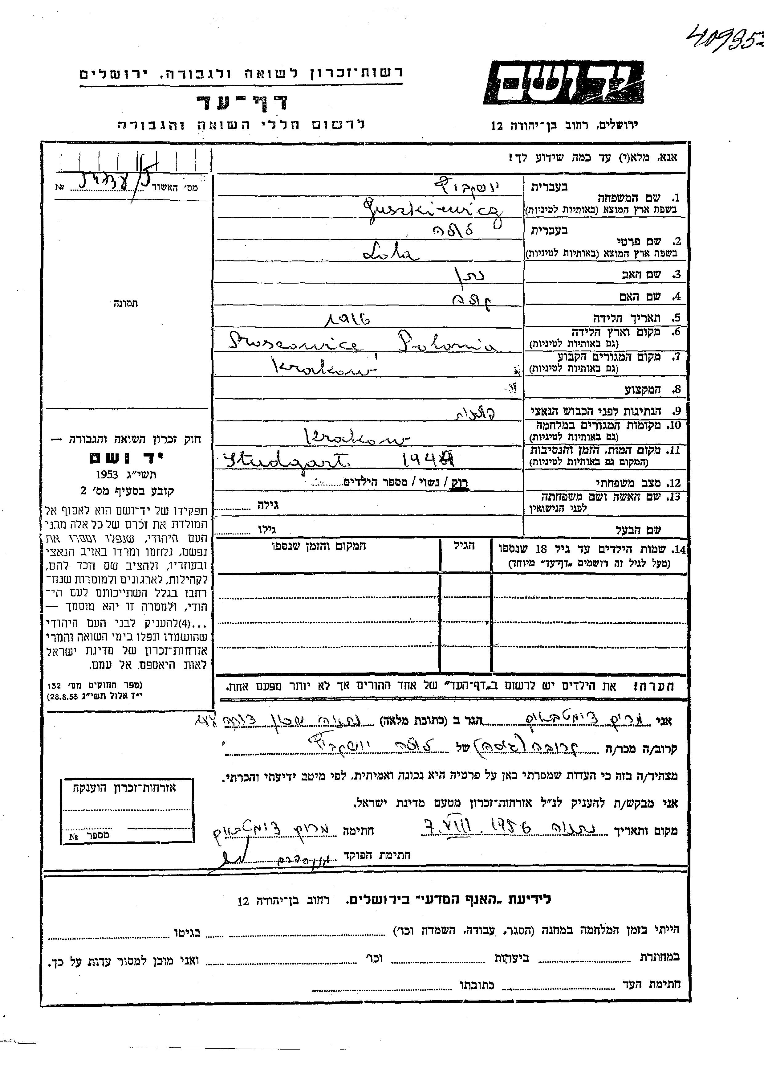 Lola Juszkiewicz was born in Swoszowice, Poland, 1916 to Natan and Lola. She was single. Prior to WWII she lived in Krakau, Poland. During the war she was in Krakau, Poland. Lola was murdered in the Shoah. Place of death: Stuttgart, Germany, 1944.