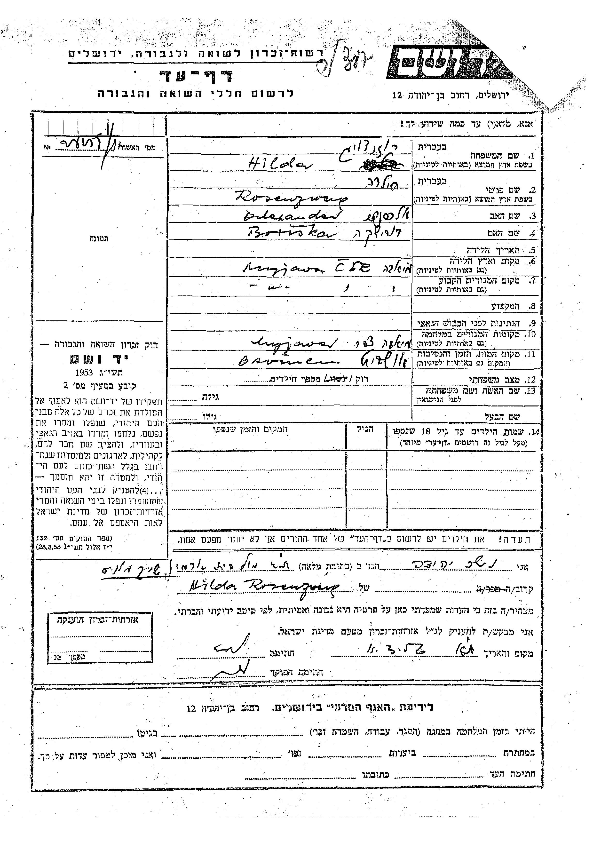 Rosenzweig Hilda unstated place, Page of Testimony
